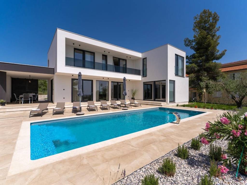 Eine Luxusvilla in Tar bei Poreč, Baujahr 2023, mit einer Gesamtfläche von 293 m² auf einem 854 m² großen Grundstück, einem 40 m² großen beheizten Pool und A luxury villa for sale in Tar near Poreč, built in 2023, with a total area of ​​293 m² on a plot of 854 m², with a 40 m² heated swimming pool and panoramic sea views. The villa is spread over three floors and offers a spacious living room, a fully equipped kitchen, a dining room and four bedrooms with en-suite bathrooms.
