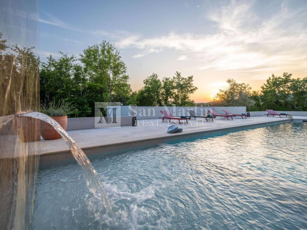 Istria, Grožnjan – designer villa surrounded by nature In the surroundings of the picturesque town of Grožnjan, this stunning designer villa is for sale! Located in a small settlement on the edge of the construction zone, the property offers complete peace and privacy. With its large plot and serene setting, this is a place where you can truly unwind and enjoy life to the fullest. Upon entering the villa, you are greeted by an impressive open-plan living area of over 100 m², featuring a stylish entrance hall, a beautifully designed living room, and a high-quality Italian kitchen. The entire living space is surrounded by large glass walls that allow an abundance of natural light throughout the day. From here, you can enjoy a relaxing view of the surrounding nature. Directly outside, there is a large swimming pool with a sunbathing area and an outdoor kitchen, next to a space prepared for a potential jacuzzi. The ground floor also includes a guest toilet and a technical room. An elegant internal staircase decorated with original artworks leads to the upper floor, which consists of three bedrooms, each with its own en-suite bathroom. Every bedroom has access to a spacious terrace offering panoramic views of the forest and the landscape. The property is heated and cooled by high-quality air conditioning units, with an electric fireplace in the living room and underfloor heating in the bathrooms. The villa is equipped with video surveillance, and the first phase of the alarm system has been installed. With its unique design, high-end furnishings, modern architecture, and peaceful location, this villa is the perfect choice for those seeking to escape the city bustle and enjoy a luxurious retreat — or for investors looking for a profitable holiday rental opportunity. ID CODE: 1020 Toni Kristijan Mob: +385 91 556 2470 Tel: +385 91 556 2470 E-mail: toni@sanmartin-realestate.com www.sanmartin-realestate.com
