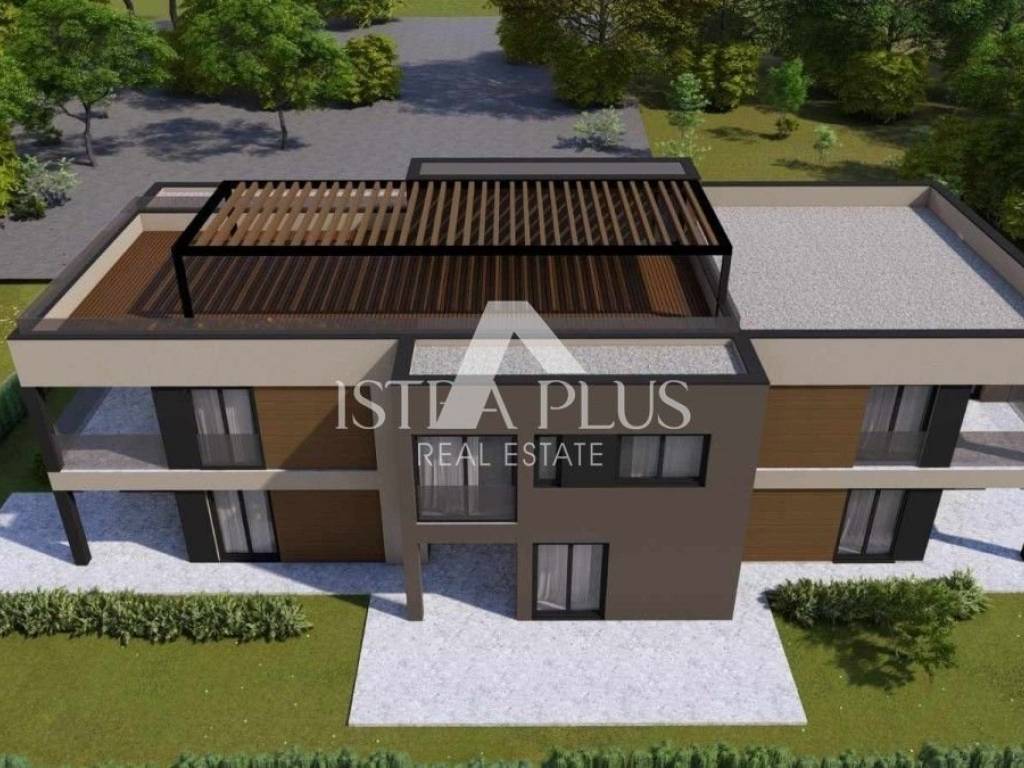 S344In a quiet village near Poreč, only 4 km from the city and the sea, apartments are for sale in a new modern building with a total of five residential units. The apartment is on the ground floor with a total area of ​​68.03 m², which also includes a terrace of 8.99 m² and a spacious garden of 120 m². The apartment consists of an entrance hall, bathroom, two bedrooms and a living room with a kitchen and dining room, which opens onto a covered terrace connected to the garden.The apartment will be sold completed to the stage where all finishing works are included except for furniture and lighting fixtures. Buyers have the option of complete interior design in cooperation with a design studio.Mitsubishi air conditioners are provided for heating and cooling, while underfloor heating will be electric. Each apartment has one parking space with preparation for an electric car charging station and a storage room located on the plot of the building.The building will be built with top-quality materials, with a two-tone facade and wooden decorative elements, insulated with 10 cm thick polystyrene. The exterior joinery will be made of Wicona aluminum profiles (RAL7039 FS) with triple-layer glass and roller shutters. The entrance doors to the apartments will be aluminum with an integrated code reader, and the apartments will have burglar-resistant and fire-resistant doors.The living areas will have three-layer oak parquet, while the hallways, bathrooms and terraces will be tiled with ceramics. The sanitary facilities will be Hansgrohe, and the building will have a video surveillance system and a smoke extraction dome on the roof. The external air conditioning units will be located on the roof so as not to disrupt the appearance of the building.For more information and to arrange a viewing, please feel free to contact us.