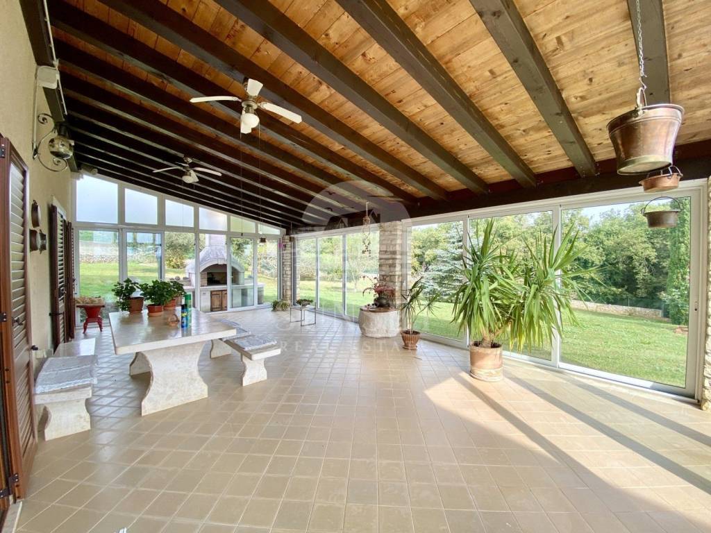 The house covers 600 m2 with a garden of 9600 m2. It is located 10 minutes (6000 m) from the sea and a natural beach, and 5 minutes (500 m) from the center. The house consists of a ground floor, first floor, and second floor. On the ground floor, there is an entrance area, a living room with a dining area (open-plan), a kitchen with an additional space (washing machine, storage, etc.), a bathroom, and a hallway. From the living room, you can exit to a terrace/sunroom, offering a beautiful view of nature.On the first floor, there is a master bedroom with an en-suite bathroom, a walk-in closet, and a closed terrace with a panoramic view of Učka. Additionally, there are two more bedrooms and a separate bathroom. The floors are made of wood imported from South Africa. The second floor offers a practically separate apartment with one bedroom, two bathrooms, and a living room.The house is equipped with thermal insulation, central gas heating, air conditioning, exotic wood flooring, and ceramic finishes in the kitchen and bathrooms. There is also an olive grove on the property, and the land is fully enclosed. There is additional storage and a garage (46 m2).The house is 50 m from the store, restaurant, and market. The doctor and pharmacy are 6000 m away, the Pula airport is 70 km away, and the Portorož airport is 20 km away. The Novigrad marina is 8 km away, and the Istralandia aquapark is only 3 km from the house.