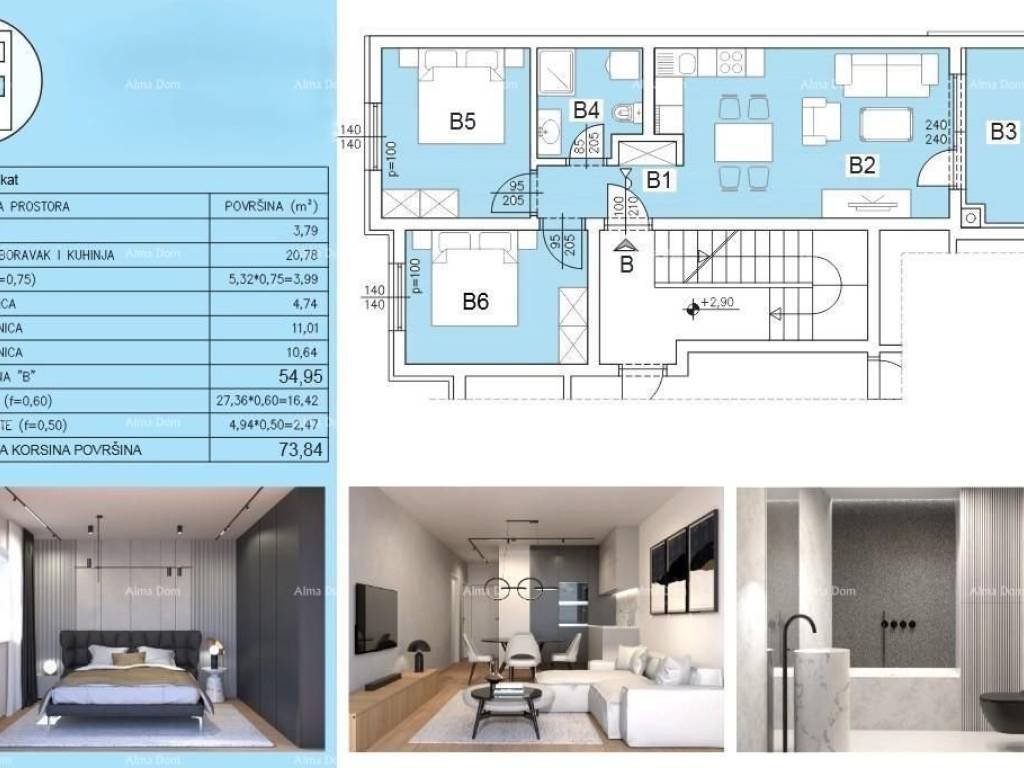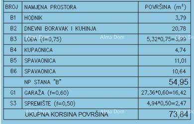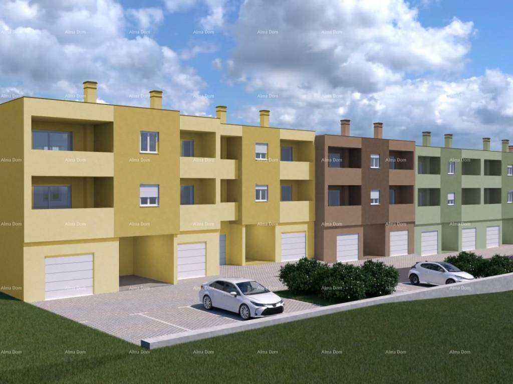 New on the market!!!For sale is a modern apartment located in an attractive area at the entrance to Pula, in a quiet and well-maintained part of the city. The project consists of six residential buildings with a total of 24 apartments, and the entire complex will be closed and private, ideal for a peaceful and secure life.All essential amenities are in close proximity – schools, kindergartens, shopping centers, public transport, and a park-forest, perfect for walks, recreation, and enjoying nature.The planned completion of construction is in the spring of 2027, with all necessary permits and high-efficiency energy certification.Apartment F-B is located on the first floor of building F and has a total area of 73.84 m², including the living area, loggia, garage parking space, and storage room.The living space of 54.95 m² consists of a living room with a kitchen and dining area, two bedrooms, a bathroom, a hallway, and a loggia that provides a pleasant space for relaxation. The apartment comes with a garage parking space and a storage room on the ground floor of the building.Special attention has been paid to the quality of construction and finishing details.Construction features:The apartments are in energy class A/A+, with 10 cm thick thermal insulation, anti-burglary entrance doors, PVC joinery with insulated glass and shutters, and modern ceramics in all rooms. Anti-slip ceramics are installed on the loggias, while air conditioning units and electric underfloor heating are planned for the living room, kitchen, and bathroom. Electric radiators with drying racks and thermostats are also installed in the bathrooms.The surroundings of the building will be landscaped with attention to detail – green areas with indigenous plants, a lawn with automatic irrigation, paved paths, and LED lighting with motion detectors create a pleasant and safe environment.This part of the city is characterized by excellent transport connectivity, quick access to the center of Pula, and all major roads. This property is ideal for family living or investment in quality new construction.For more information, please contact:Azra +385 91 611 5706 +385 98 420 885 azra@almadominvest.com