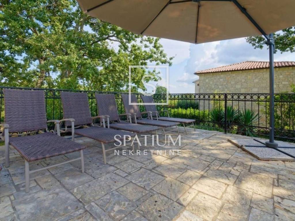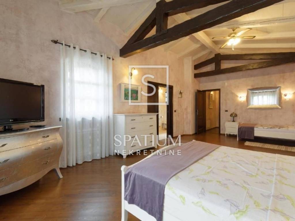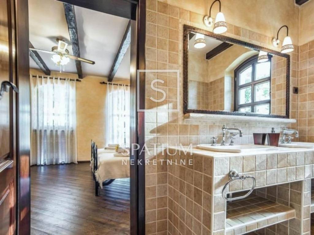 POREČ, in the offer we received a rustic villa of 352 m2. On the ground floor there is an entrance hall, spacious living room, kitchen, dining room, toilet, laundry room, spacious covered terrace with outdoor kitchen and dining area. It contains two bedrooms each with its own bathroom, and one bedroom has both a Turkish and a Finnish sauna. Upstairs there are two spacious bedrooms, each with its own bathroom and private terrace with a wonderful view of nature and the sea in the distance. There is a heated swimming pool with a tavern and a sauna on a large, beautifully landscaped garden of 1038 m2, which provides privacy due to the completely fenced plot. The basement of the house was converted into a tavern with a large space for socializing, a wine cellar, a bar, an auxiliary kitchen and a bathroom. The facility has been modernized according to EU standards while maintaining the traditional Istrian exterior and beauty. It is heated by central floor heating, fan convectors and a fireplace in the living room. The property is located in a quiet location with several parking spaces and is surrounded by three-century-old olive trees and oak trees, in a picturesque village 15 minutes away from the sea, beaches and the center of Poreč. Which is an ideal opportunity for a peaceful family life as well as for engaging in tourism services.
