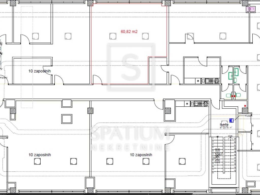 Ukupna površina ureda je 60,22m2. Velike staklene površine garantiraju ugodnu radnu okolinu te osiguravaju dovoljnu količinu dnevnog svjetla.