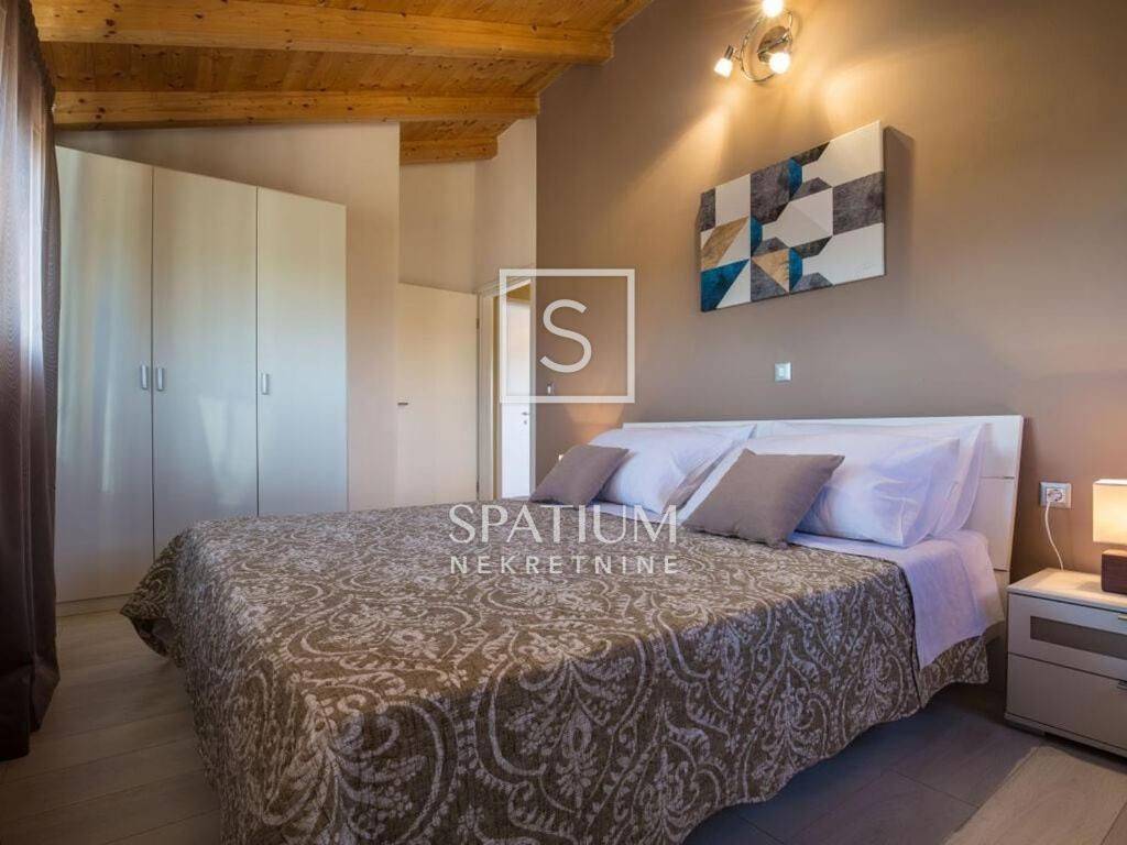 FAŽANA, we offer a house with a swimming pool and a view of the sea. Living area 180m2, and spacious garden 2300m2. It consists of a ground floor and a first floor. A spacious living room with a fireplace and access to a covered terrace, kitchen, dining room and toilet are located on the ground floor. Three large bedrooms and a spacious bathroom, upstairs. Inside the landscaped and fenced garden there is a swimming pool with a sunbathing area, a barbecue, a space for socializing, a parking space for several vehicles, a basement and a garage, and a green area. It is located in a quiet area, 700m away as the crow flies from the sea and the center. High-quality construction, fully equipped with designer furniture, location and sea view are the features of this valuable property. An opportunity worthy of attention!!