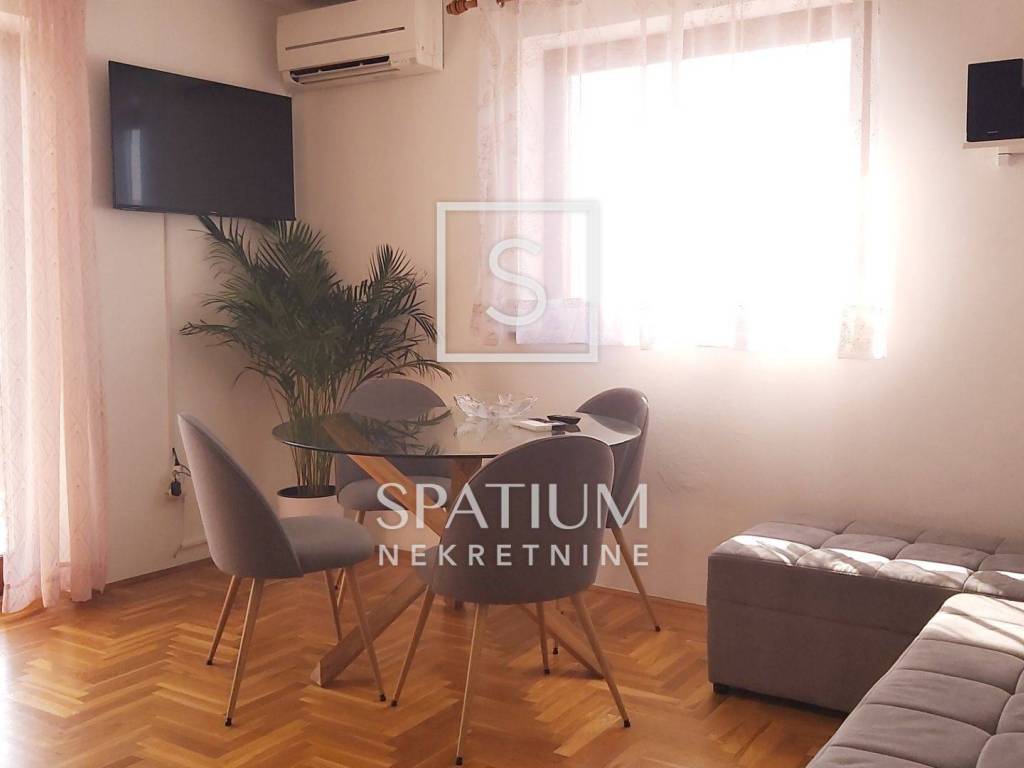 RABAC, a fully furnished apartment with a surface of 43.67 m² is available for sale, located on the first floor of a residential building in a quiet street. The apartment consists of a kitchen with dining area and living room, one bedroom, and a bathroom. Two spacious terraces with an open sea view provide the perfect place to relax and enjoy the Mediterranean surroundings. The apartment also includes a storage room in the basement. It is equipped with an air conditioning unit, while the chimney allows an additional heating option with wood or pellets. The property has clean ownership, free of encumbrances, and all essential amenities and beaches are within walking distance.