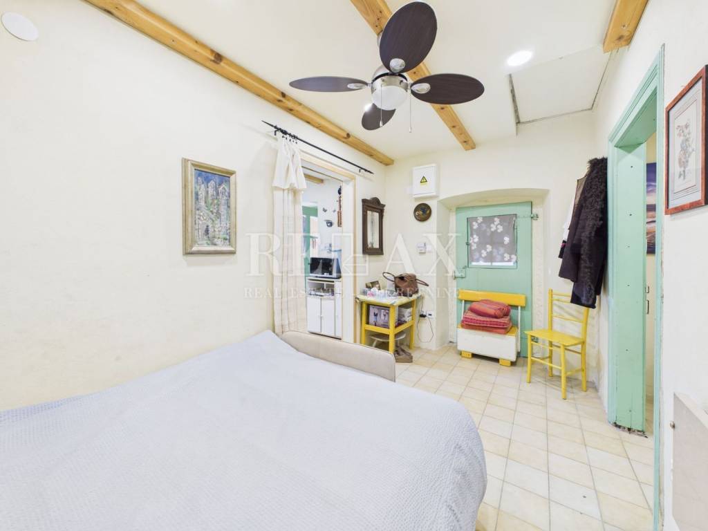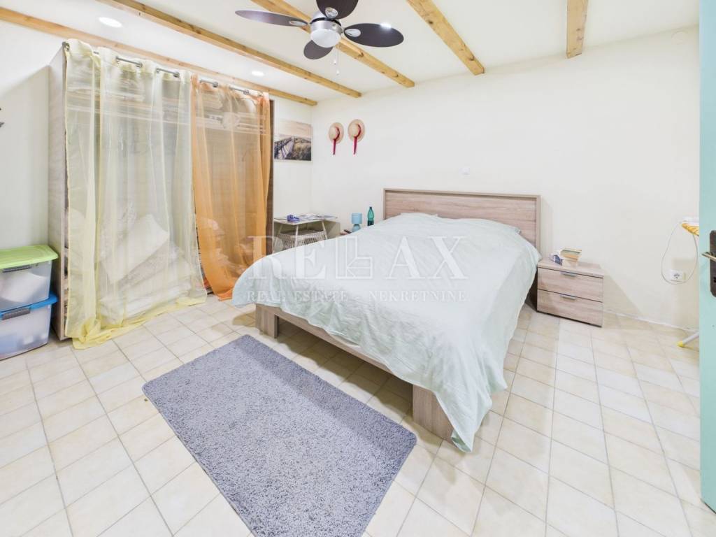 The 60 m² courtyard is enclosed by stone walls and offers a pleasant outdoor space, including a covered wooden pergola with benches – a perfect spot for enjoying summer evenings. On the upper floor, there is a kitchen, a smaller and a larger bedroom, and a 15 m² terrace facing southwest, allowing plenty of natural light throughout the day.