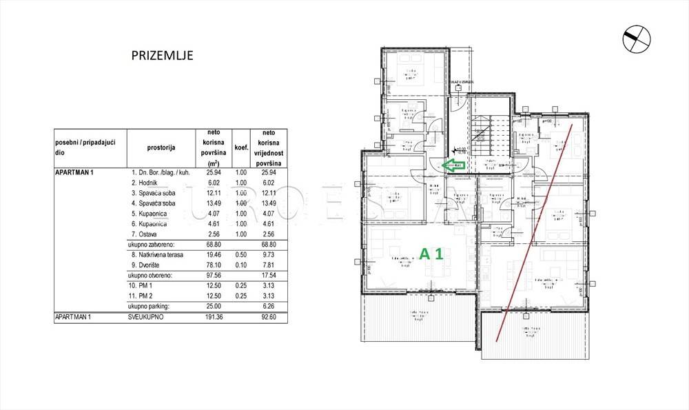 - nekretninu čini apartman u prizemlju zgrade, dvorište i dva pripadajuća parkirna mjesta u dvorištu zgrade, sveukupne neto korisne (obračunske) površine 92.60 m2,