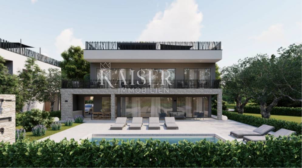 Kaiser Immobilien puts on the market a new exclusive villa only 200 m from the sea. This beautiful new modern unique villa is located on the northwestern coast of Istria in the city of Poreč. It is only a few km from the center of Poreč. The villa is located on the coastal side of the city of Poreč, not far from the beach. The villa is spread over a plot of 1502 m2 and was built as part of two other identical neighboring villas, connected as duplexes. The villa consists of a ground floor and a first floor and a decorated roof with its contents such as a jacuzzi, sunbeds and a corner sofa to enjoy an additional superb view of the sea, the city of Poreč and the vineyards and olive groves on the other side. On the ground floor of the villa there is a kitchen, dining room and living room, an outdoor kitchen, an outdoor dining terrace and a small toilet. On the first floor there are 3 bedrooms with their own bathrooms, one of those three bedrooms is a master bedroom with its own master wardrobe and master bathroom. There is also a beautiful covered balcony with a view of the pool that stretches along the entire length of the villa. The special feature of this villa, apart from the fact that it is located 200 m from the beach, is that the villa is equipped with top quality materials, a very modern design with a small addition of indigenous traditional style unique to this part of Istria. Very important note, for now there are 3 such identical houses, duplexes, in the project, however, a very important fact is that the project can be changed according to the customer's wishes, even to the extent that there can be 2 identical houses or even one on the same land. There are possibilities of carrying out works in different aspects according to the wishes of our customers. Each villa will have 2 covered parking spaces and an asphalt access road. If you want this beautiful new unique villa to become your new home, not far from the sea, contact your agent.