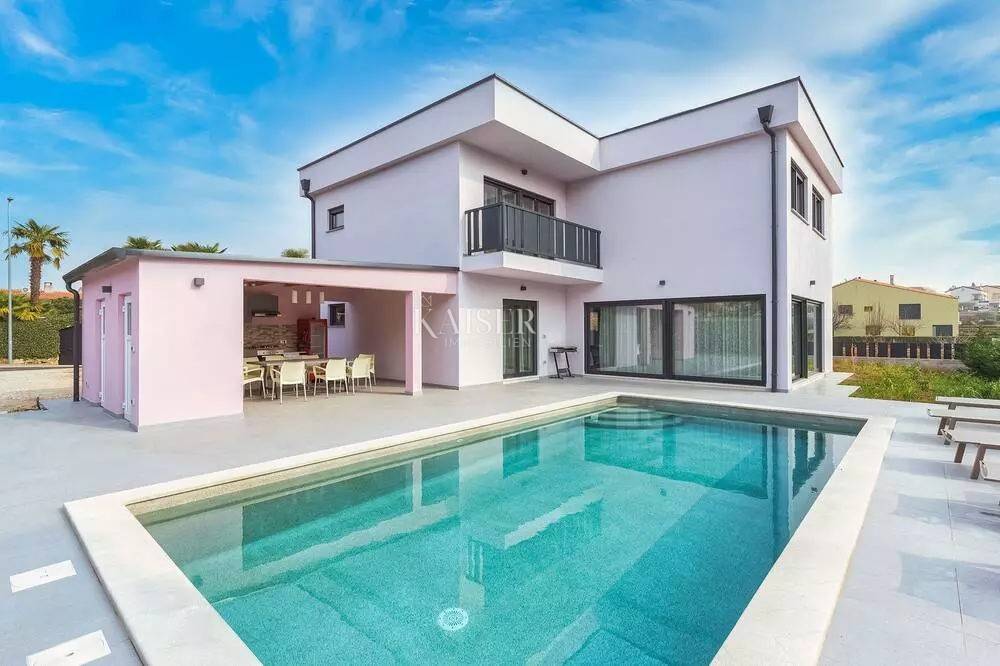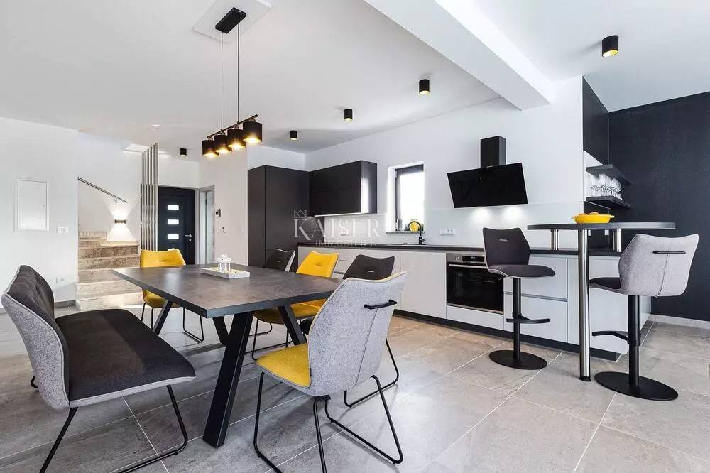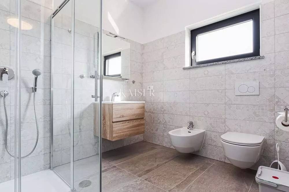 Kaiser Immobilien represents a true beauty among villas located only 800 m from the sea in the town of Poreč. The villa is sold fully equipped with all its contents. This beautiful villa built as a detached building on two floors in a quiet area of the city of Poreč. The villa consists of 4 bedrooms and 4 bathrooms, each belonging to its own bedroom. All bedrooms are air-conditioned and have TVs in the rooms. Three bedrooms are located on the first floor of the villa, while one bedroom is located on the ground floor. On the ground floor of the villa there is a kitchen, a dining room and a living room. The whole concept of the interior is based on a lot of light, since the villa is made with wide carpentry that gives a lot of light throughout the day. The villa was built to a very high quality and modern, and every detail and the needs of the new owners were taken care of. In this sense, the carpentry of the villa is three-layer, which absolutely does not let in noise, and there are electric blinds and mosquito nets on the windows. The villa is heated by a floor heating system via Viesmann heat pumps, while the rooms also have their own air conditioners. The villa is equipped with high-quality furniture, all custom-made by certified carpenters. The roof of the villa is made of aluminum sheet where there are also solar panels for heating water. The facade of the villa is made of 10 cm thick anthracite. There are alarm sensors on the entire carpentry of the villa. Outside the villa there is a lawn with an irrigation system, while one part is paved where you can park up to 4 vehicles. The size of the pool of the villa is 8x4, the pool is heated and made of material kurir. The edge of the pool is lined with Brač stone, which is known above all as a very solid, high-quality and long-lasting stone. Right next to the pool there is a shower for additional refreshment, and a very walkable, comfortable area around the pool for swimming and sunbathing. There is an outdoor toilet nearby. In the courtyard of the villa, there is an outdoor kitchen with a barbecue and all the elements that will make enjoying summer days and warm evenings even more beautiful. The villa is located only 800 m from the sea, and is close to all necessary amenities. The whole village as well as the beach can be visited on foot or by bicycle, everything is very close and that is exactly what gives this wonderful villa its special charm. If you want this beautiful villa in a wonderful location to become your new home, contact the agency Kaiser Immobilien Poreč. The commission of the agency for the buyer is 3% + VAT and is paid in case of real estate purchase, when the first legal deed is concluded.
