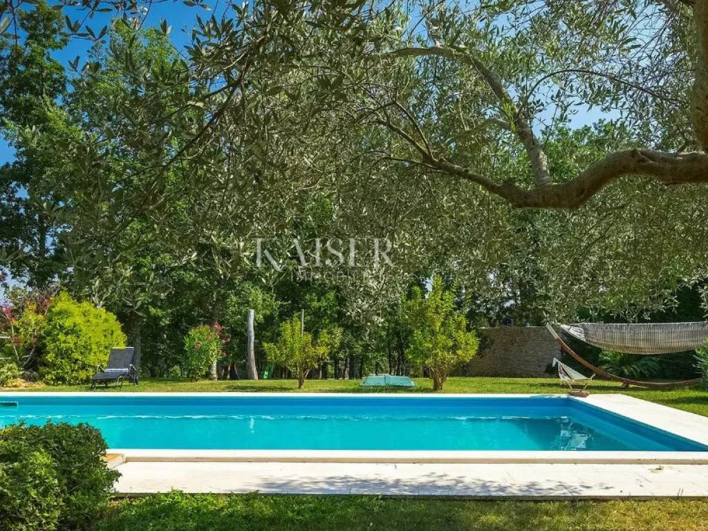 Kaiser Immobilien presents an imposing, stone villa that came new for sale. In nature itself, on a branch of the forest, on the edge of a small Istrian village, this beautiful villa is located, which offers complete peace, pleasure and privacy. The villa is located on the West coast of Istria, only ten minutes away from the small historic Istrian town of Višnjan, which is widely known for its excellent olive oils from our hardworking olive growers and the most modern and unique wine cellars of our best winemakers. The distance from the sea, the first beaches and the city of Poreč is 15 km. This imposing stone villa is located in the heart of nature on a spacious yard area of 4212 m2. The entire yard is surrounded by a tall green hedge that gives complete privacy. The pool, which is 70 m2 in size, fit perfectly into this spacious, beautiful yard. Inside the courtyard there is a newly installed volleyball court, with a grass surface and raised embankment area for use, there is a children's playground, a corner for a ping pong table, various swings, a barbecue and a spacious landscaped lawn with beautifully planted botanicals. The uniqueness of this yard is given by the old oak trees, which are overwhelmingly large and thus create shade and oxygen in the yard throughout the day. The villa consists of a ground floor and one floor, and another apartment of 57 m2 was subsequently built in, which can be used for additional guests. The gross size of the villa is 314.09 m2. In addition to the many positive and excellent characteristics that this villa has, there is also the fact that its entire layout is formed in such a way that from every room or bedroom you are in, you have direct access to the pool, to the covered terraces or to the yard, where you can enjoy a fantastic view. . On the ground floor of the villa there are three beautiful bedrooms, two rooms share one bathroom, and one room has its own bathroom. There is a spacious living room, kitchen and dining room equipped with unique wooden furniture specific to real villas. The entire lower area provides access to the yard and the pool through real wooden quality joinery. On the ground floor there is also a technical room and a guest toilet. The upper floor of the villa is connected to a beautiful stone staircase that is protected by a forged handrail. On the upper floor there is the main master room, beautifully decorated with bathrooms with old wooden furniture and a jacuzzi tub, and a wonderful covered terrace with a view of the yard, the forest and the entire nature that surrounds you. Next to the villa there is another additional apartment, equipped with a kitchen, a bedroom and a toilet. It is currently used as a storage area. The heating options are different, the entire lower part is installed with underfloor heating, with the addition of air conditioning and a fireplace. Since the upper part is covered with a wooden floor, it is heated by gas central heating via radiators, with the addition of air conditioning. The courtyard of the villa offers a handful of possibilities for use and stay considering its size, there is an outdoor grill, a covered terrace for dining, various playgrounds and more. Considering that the villa is located next to bike paths, it offers the possibility of sports, cycling, family gatherings and long stays in nature. Distance of the property to the city: Poreč - Pula Airport, 45 km Poreč - Ljubljana, 162 km Poreč - Vienna, 544 km Poreč - Prague, 868 km Poreč - Munich, 565 km If you want this beautiful and imposing villa to become your new home, please contact agent at phone number 00385 923782803, or at the email address: ivana@kaiser-immobilien.hr. Agency commission is 3% + VAT.