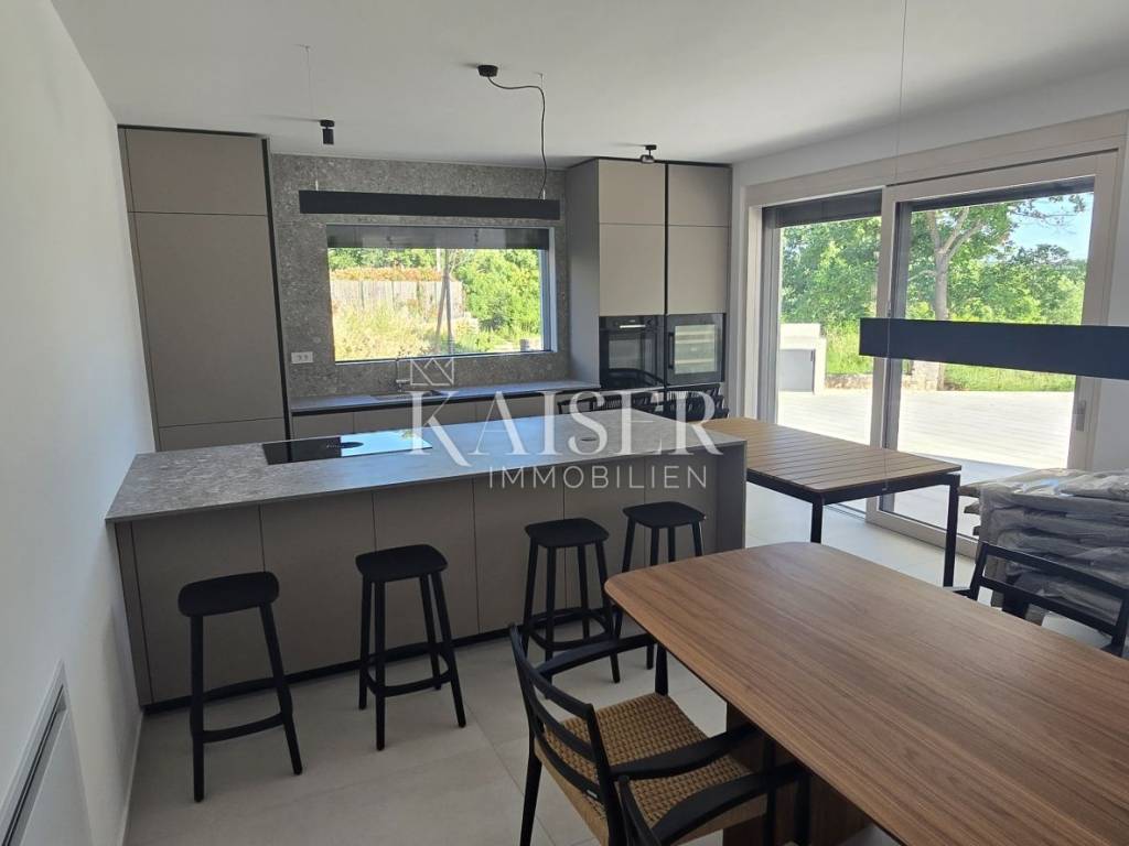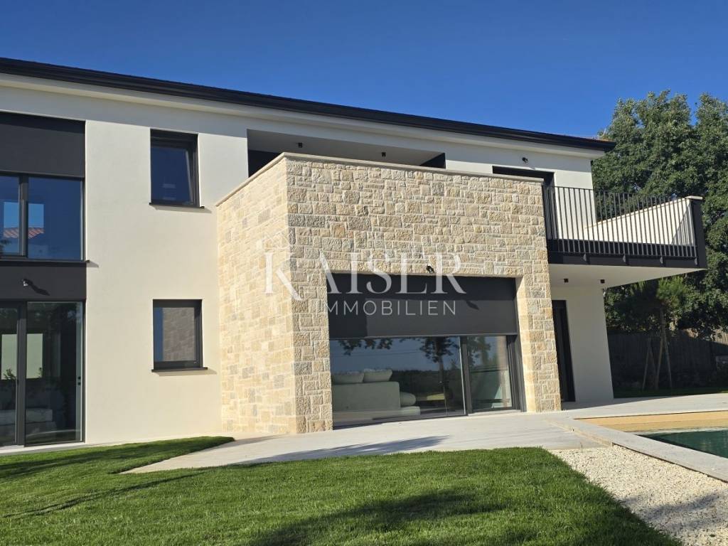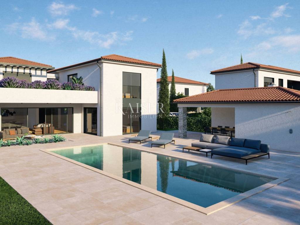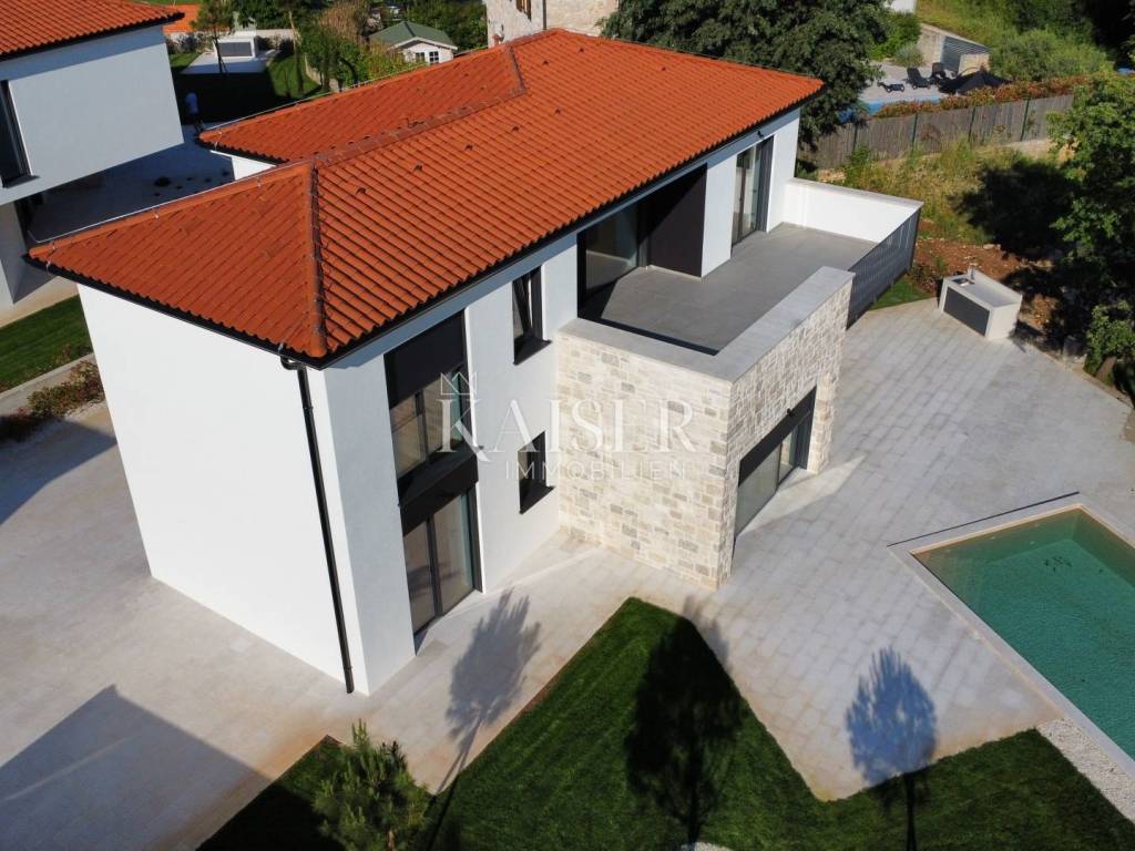 Kaiser Immobilien presents a new modern villa near Poreč. The villa is located in a new settlement of three similar villas, only 11 km from the city of Poreč and the first beaches. Its location is a very peaceful autochthonous environment that guarantees you relaxation and relaxation with the local population that lives there. Only 2 km away is a small autochthonous Istrian town with all the necessary facilities such as a shop, restaurant, pizzeria, school, hairdressers, coffee bar and more. The villa is located on a plot of 751 m2 with a swimming pool, sauna and private yard. The villa consists of a ground floor and a first floor. On the ground floor of the villa there is one bedroom, bathroom, living room, kitchen and dining room and storage room. The entire lower part of the villa is built in the open space style, which gives you an open view of the entire space with lots of sunlight. The lower part leads to the pool and covered terrace, and to the yard with a summer kitchen. On the first floor of the villa, there are two more spacious bedrooms, one of which has its own bathroom and exit to the terrace with a view of nature and the pool. The second room has a separate bathroom. The attraction of this villa is certainly the sauna located on the first floor, with an entrance hall leading directly to the terrace. Heating and cooling is provided by underfloor heating with a heat pump and valve convectors. Additional features: - All windows and doors are made of wood/aluminum manufactured by M-SORA - All rooms have underfloor heating (heat pump) - Cooling with built-in fan coils (convectors) - Each villa has a swimming pool with modern foil RENOLIT ALKORPLAN TOUCH in Relax color, which makes the color of the water natural - Facades: a combination of stone facades and facades from the manufacturer STO ("Mercedes" in facades) - All internal doors from floor to ceiling, meaning height approx. 270 cm - Floors: Italian ceramics of larger dimensions and oak parquet in the bedrooms. - Swimming pool - possibility of installing a heat pump - Video intercom - Possibility of video surveillance (all installation done) - Possibility of alarm system (all installation done) Distance of the property to the place: Poreč - Pula Airport, 45 km Poreč - Ljubljana, 162 km Poreč - Vienna, 544 km Poreč - Prague, 868 km Poreč - Munich, 565 km The property is in the VAT system, so the buyer is not obliged to pay real estate transfer tax. If you want this modern and quality built villa to become your new home, contact the agent at phone number 00385 923782803, or email address: ivana@kaiser-immobilien.hr Agency commission is 3% + VAT.