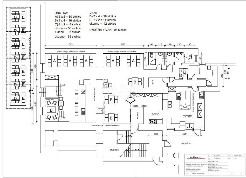 Objekt je ukupne korisne površine od 156,62m2, a tlocrtno objekat se sastoji od ulaza 2,22m2, centralne sale s prostorom za šank i dvije pozadinske sale za goste, ukupne netto površine od 90,54 m2, kuhinje s pratećim prostorima netto površine 44,51 m2, dva wc-a za goste i 1 wc za radnike sa prostorima za skladištenje, sanitarni čvor netto površine 12,57m2, spremište od 6,98m2