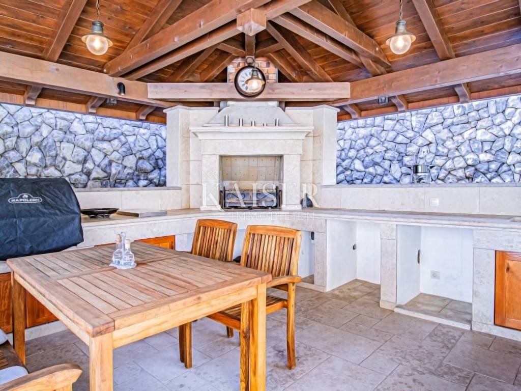 Kaiser Immobilien presents a unique property located on the Opatija Riviera, next to Opatija itself, known as the Pearl of the Adriatic. Opatija is synonymous with Mediterranean charm and a top quality of life, and this villa offers the perfect blend of elegance, comfort and luxury. The villa is located on a plot of land measuring 1,435 square meters, while the building itself covers 470 square meters. Its architecture and interior exude a sophisticated style, and the spectacular panoramic view of the sea, the town of Ičići and the ACI marina further emphasizes its exclusivity. Layout of the villa: On the ground floor there is a wellness and fitness area, a storage room, a boiler room, a relaxation room and a luxurious bedroom with a private bathroom. On the first floor there is a living area with a spacious living room, a kitchen and dining room with access to the terrace, a study and an anteroom with a dressing room. The second floor consists of a private night area with three bedrooms, each with its own bathroom. Among them, the large master bedroom stands out, and all rooms have a sea view and access to a spacious shared terrace. Top-notch equipment and materials: The flooring throughout the villa is made of refined Italian Botticino Classico marble combined with Emperador Darko, creating an atmosphere of luxury and elegance. The living room is adorned with a handmade fireplace that further emphasizes the cozy atmosphere of the space. The villa is equipped with Daikin heat pump underfloor heating and fan coils for air conditioning and ventilation. In addition, it is a smart home that allows you to control lighting, heating and security systems via the internet and mobile applications, thus providing maximum comfort and safety. The bedrooms have African oak parquet from the renowned German manufacturer Haro. The bathrooms are equipped with high-quality sanitary ware from the Italian company Olympia Ceramica. The walls are finished with the Velatura technique from the manufacturer San Marco, while the wallpaper is from the Portofino factory. The ceramics are from the Piemme Valentino brand. The doors and furniture are custom-made from solid wood in the Spanish factory Muebles Cercos, while the kitchen is equipped with premium household appliances from the Smeg brand. Outdoor area: This villa offers a beautifully landscaped Mediterranean garden, an infinity pool with a spacious sundeck, covered and uncovered terraces, an outdoor kitchen, a barbecue and an outdoor dining area. The property also has a two-car garage and additional parking spaces for several vehicles. Total built area: 470 m² Indoor area 385 square meters Covered terraces 150 square meters Outdoor infinity pool 50 square meters This villa offers the ideal combination of luxury, comfort and privacy and is the perfect choice for those looking for an exclusive home in one of the most beautiful locations on the Adriatic. Distances to EU cities: Cities: Munich (533 km), Vienna (514 km), Prague (840 km), Budapest (595 km) Airports: Pula (90 km), Rijeka (39 km) Contact us for more information or to arrange an appointment. Phone: +385 91 540 4646 Kaiser Immobilioen – Your partner for premium real estate in Croatia.