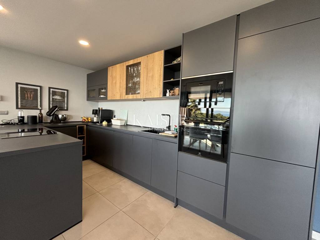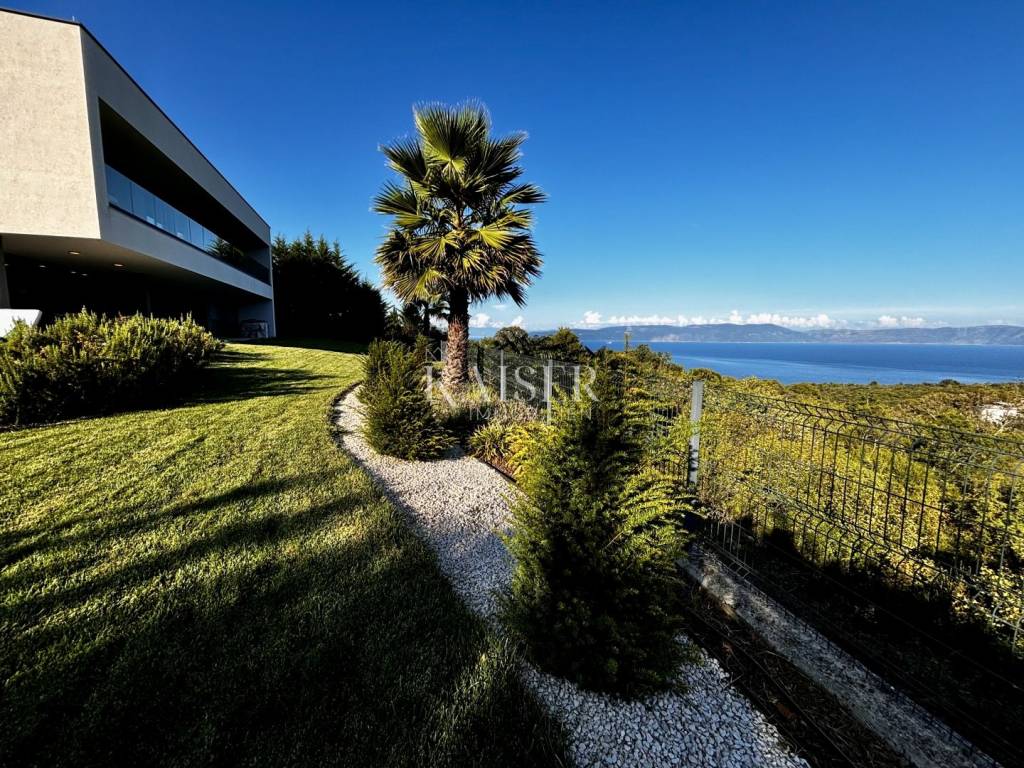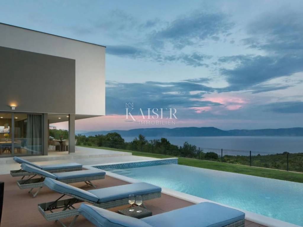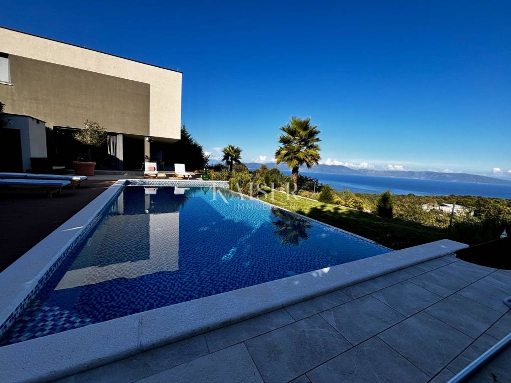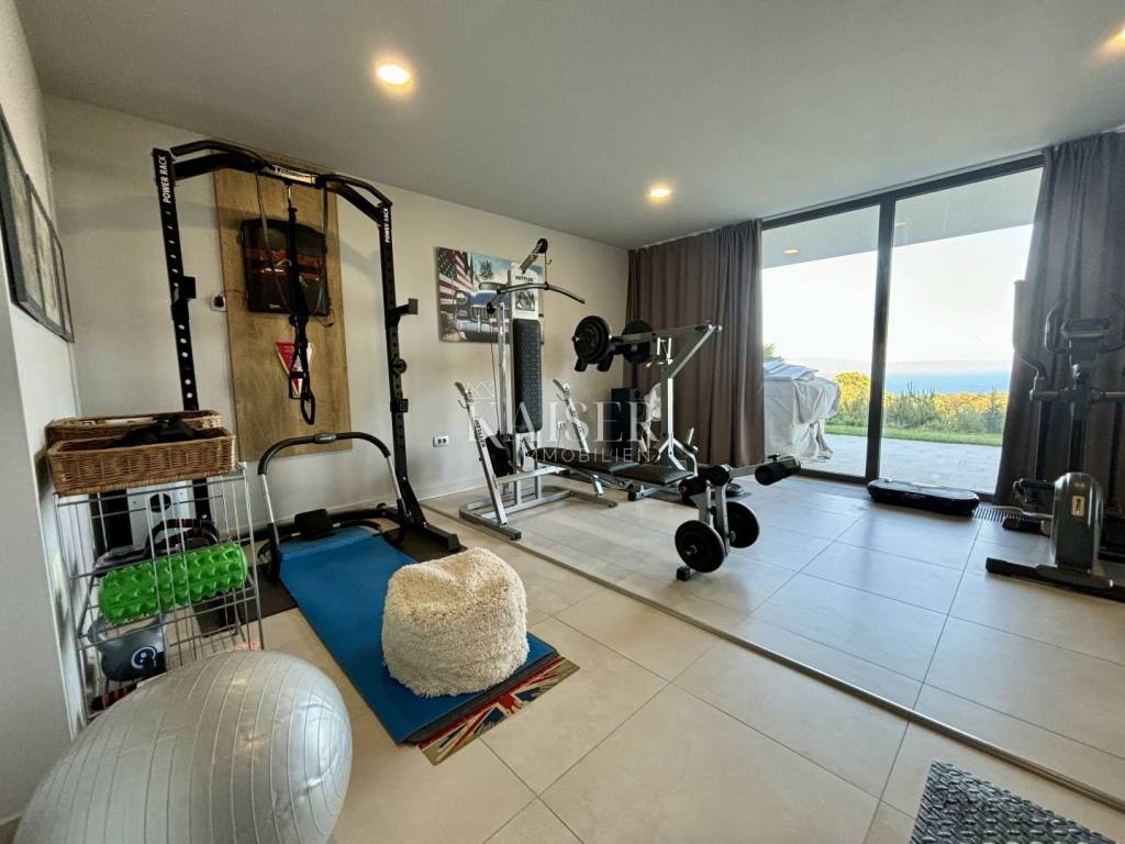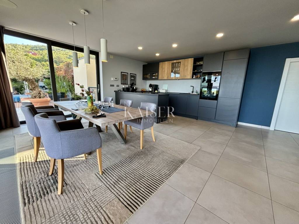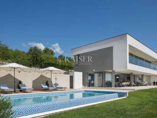 Kaiser Immobilien presents a unique villa with the sea in the palm of your hand. The villa is a modern luxury oasis with panoramic views and impeccable design. This luxurious new building is located in an exceptional location in a quiet and green area, just one kilometer from the sea. The villa is located in the vicinity of Rabac, a famous tourist destination with one of the most beautiful beaches in Istria and Kvarner. It is located on the Skitača peninsula, a luxurious location with numerous hidden coves and crystal clear sea. With a total of 210 m² of living space, the house offers a superb combination of modern design, functionality and comfort, while providing incredible privacy and a sense of relaxation throughout the year. The space consists of five spacious bedrooms, four elegant bathrooms and an additional toilet, while the abundance of glass surfaces ensures maximum light and an open view of the sea and nature. The house also has a gym, providing additional comfort and the possibility of an active lifestyle without having to leave your own home. On the ground floor there is a spacious, open kitchen with a dining room and a living room that are harmoniously connected into one whole. The living area opens onto a covered terrace that invites you to relax in the sun and fresh air. The ground floor also offers an additional bedroom (gym), ideal for guests or as a work space, and a separate toilet, ensuring complete practicality of everyday life. On the first floor there are four spacious bedrooms, each with its own modern bathroom and access to a terrace overlooking the sea and nature. The floor is further enhanced by an elegant gallery and a modern internal staircase that visually connects the floors, giving the space airiness and architectural dynamics. The entire interior is abundant in natural light thanks to large glass walls that open up views of the surrounding greenery and the sea. The interior is carefully designed in a contemporary style with warm, neutral tones and soothing shades of blue that are reminiscent of the Mediterranean environment. High-quality materials were used, and every detail was thought out to create a feeling of lightness and sophisticated luxury. The 1,150 m² plot is fully landscaped and well-kept, with a beautiful garden that highlights the richness of Mediterranean herbs such as lavender, rosemary and olive trees. In the central part there is an elegant swimming pool surrounded by a sunbathing area, perfect for enjoying during warm days, while a covered terrace with a barbecue and dining area provides an ideal place for relaxing and socializing outdoors. A large private parking lot with enough space for several cars further contributes to the practicality and comfort of everyday living. This property represents the perfect blend of modern architecture, luxurious amenities and untouched nature. Located in a peaceful environment, yet close to all important amenities and the city, it is ideal as a family home, a holiday home or as an investment with high tourist potential. Every detail of the space has been designed to provide an experience of relaxed but sophisticated life in harmony with the Mediterranean ambience. It is only 12 kilometers from the nearest larger town, Labin, while the famous tourist center of Rabac and its beautiful beach are a 15-minute drive away. The city of Pula, with its international airport and rich cultural and historical heritage, is 45 kilometers away, while Opatija and Rijeka are within an hour and a half drive. Slovenia and border crossings are about an hour away, and Trieste and Italy are also easily accessible for day trips. For more information, contact the agent. Ana Beović +385 91 618 3332 ana@kaiser-immobilien.hr
