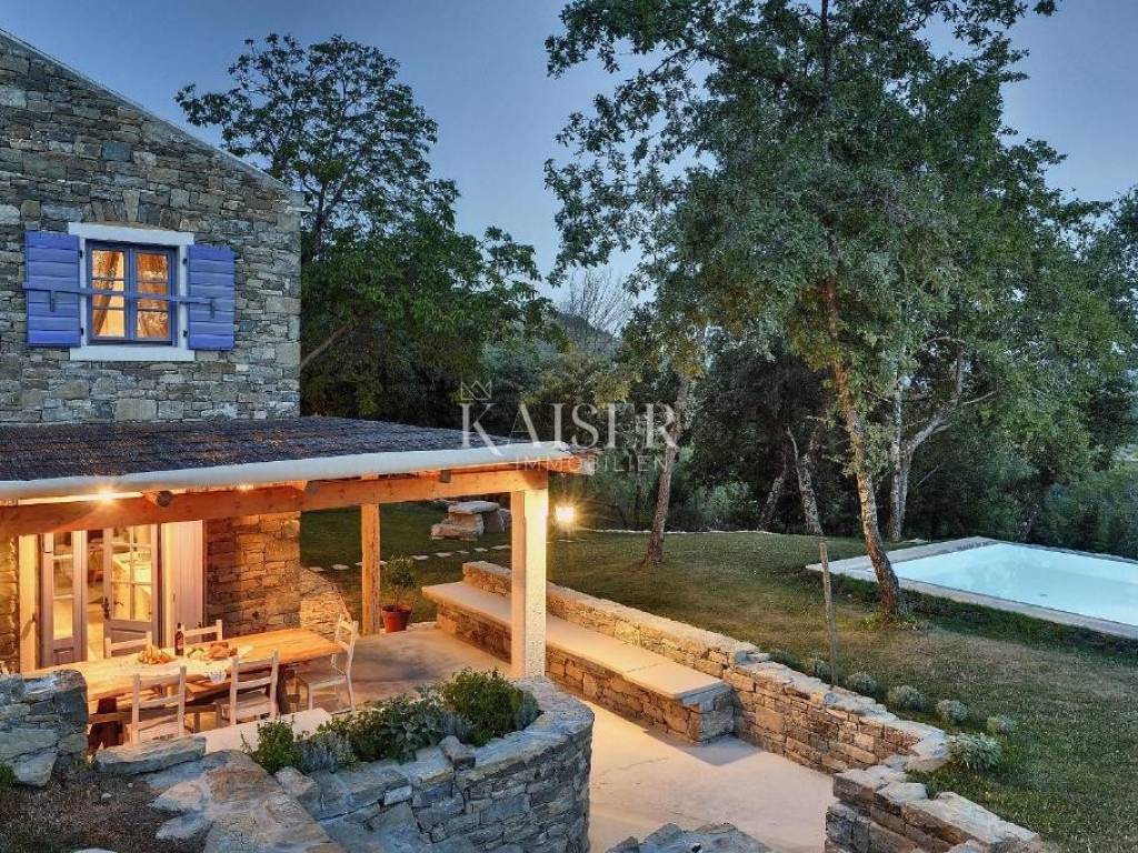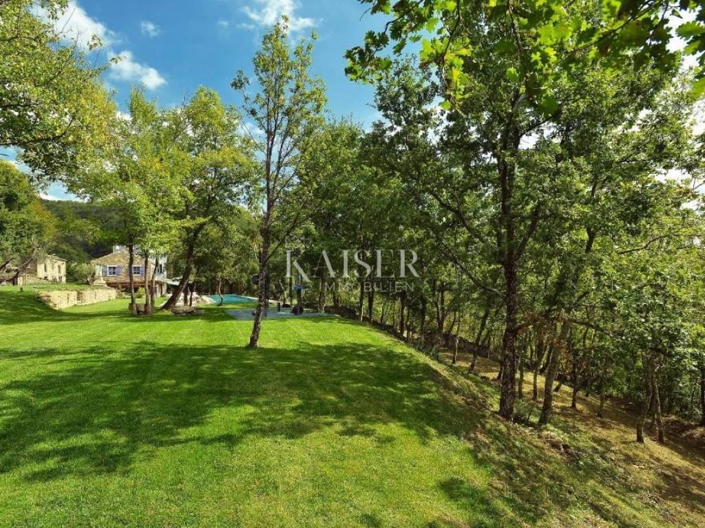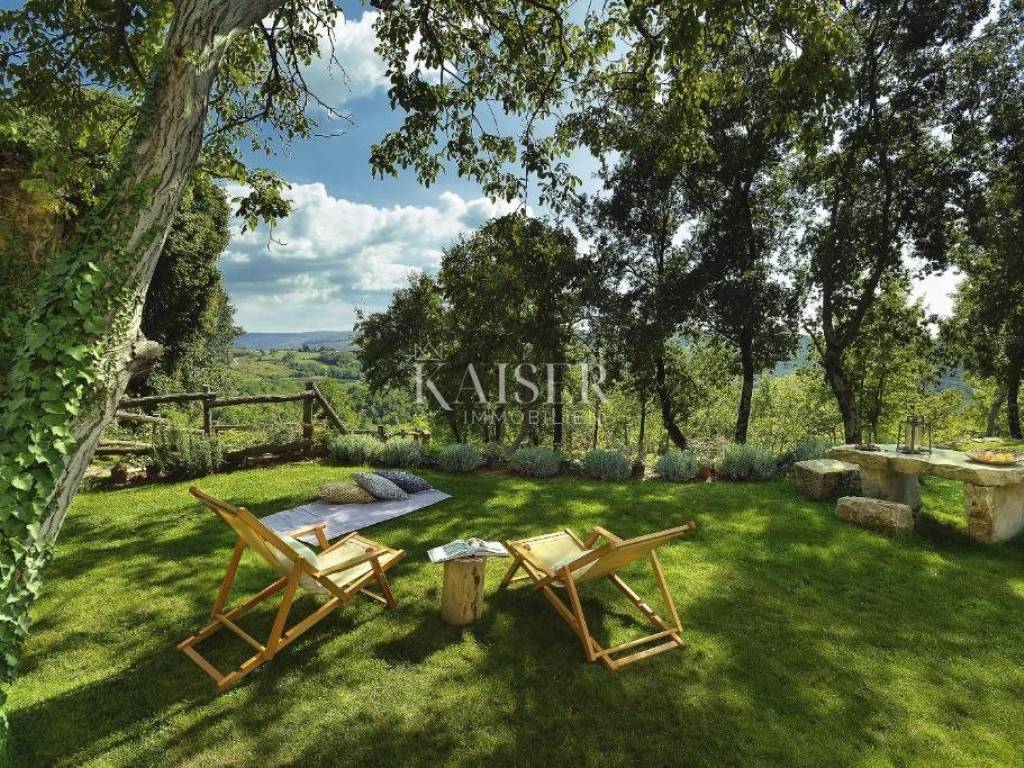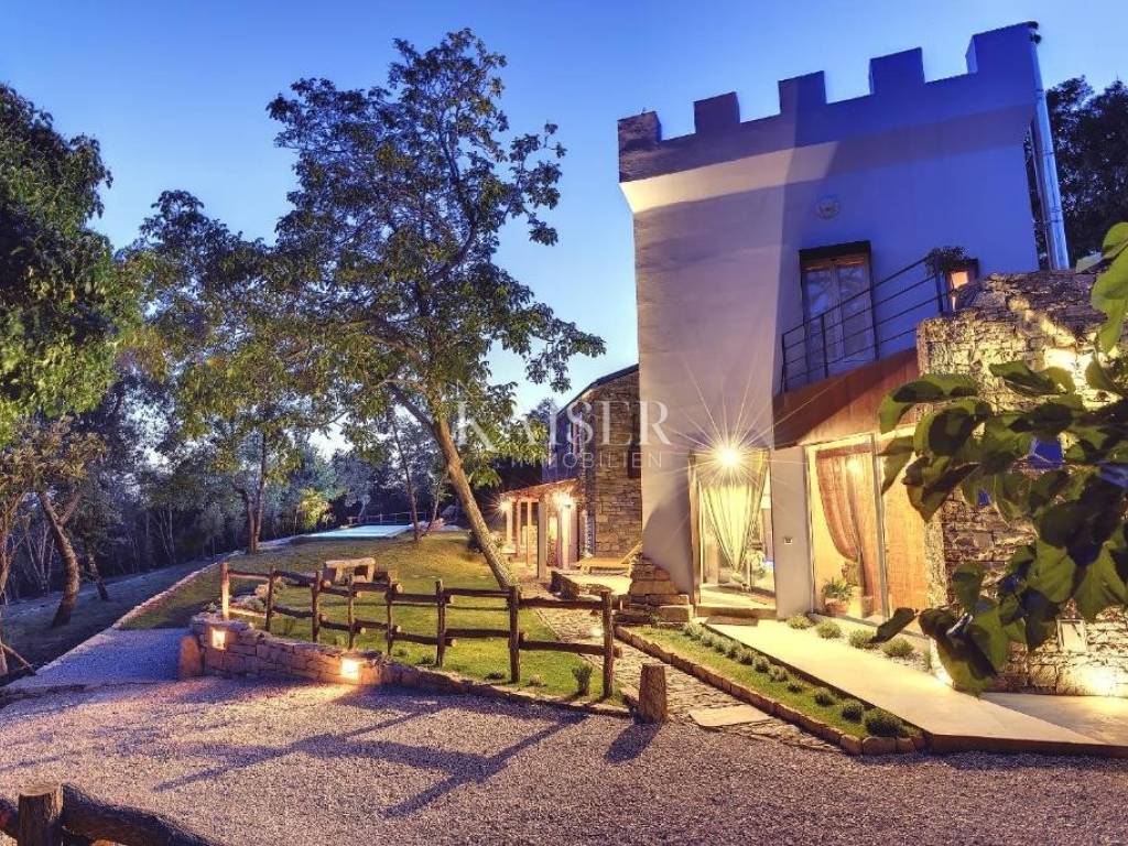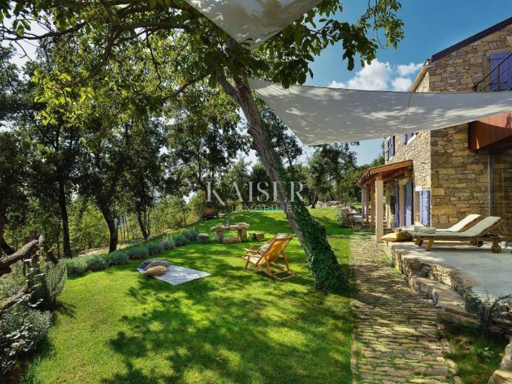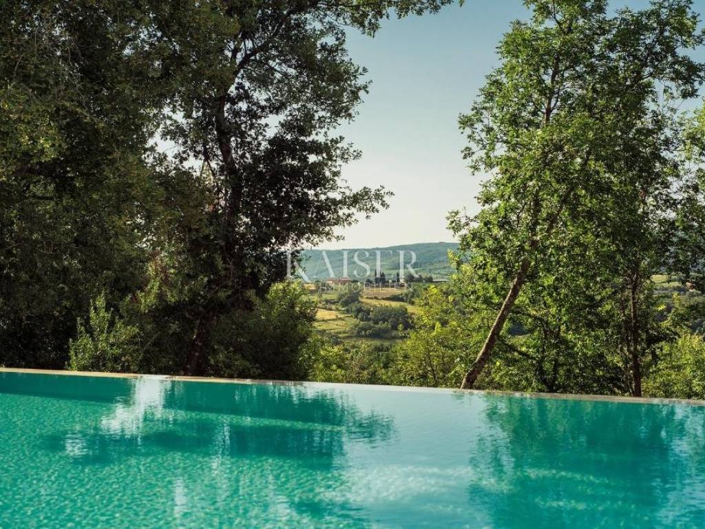 Kaiser Immobilien presents you a unique villa in a secluded location surrounded by untouched nature. For sale is an enchanting villa located on a beautiful estate in the heart of nature, a perfect haven for those seeking peace, privacy and luxury. This unique property is located in a secluded location, far from the hustle and bustle of the city, surrounded by greenery, silence and the beauty of untouched nature. The villa consists of a ground floor and an upper floor and exudes charm and character thanks to carefully selected details and a unique interior. On the ground floor there is a spacious, modernly equipped kitchen, a comfortable dining room, an airy living room, an elegant bathroom, a jacuzzi, a sauna, a utility room and a specially decorated room for relaxation and enjoyment. On the ground floor of the Villa there is a unique covered terrace for relaxation, socializing and rest. On the first floor there are three spacious and luxuriously decorated bedrooms, each with its own private bathroom, which provides maximum comfort and privacy. The villa has a gross area of 326 m2, of which the ground floor consists of 157 m2 net area, the first floor consists of 101 m2 net area. The villa also has a beautiful roof terrace of 32 m2. This unique villa additionally delights with its impressive 100 m2 infinity pool, perfect for enjoyment, relaxation and unforgettable moments under the open sky. The pool harmoniously fits into the natural environment, and its openness provides a feeling of infinity and complete peace. In the immediate vicinity of the pool there is a specially equipped outdoor fitness, ideal for exercising in the fresh air, surrounded by peace, greenery and forests. Here, a healthy lifestyle blends with nature in perfect harmony. The entire property is adorned with a well-kept garden, rich in luxurious plants and carefully selected trees that ensure complete privacy and peace. The space exudes natural elegance, and every corner of the garden invites you to relax, meditate or simply enjoy the silence offered by this beautiful location. This property represents the perfect combination of luxury, natural beauty and complete peace – a true paradise for lovers of nature, peace and elegance. The villa is located in the picturesque Istrian countryside, in the immediate vicinity of the medieval Grožnjan – a city of artists, famous for its international colony of artists who during the summer months transform the entire area into a vibrant cultural center. Narrow stone streets and authentic Istrian houses make Grožnjan a unique place that enchants every visitor. The villa is an ideal starting point for exploring the gourmet and wine delights offered by nearby Motovun, Oprtalj, Momjan and Buje – places rich in history and tradition, known for their top-quality wines, truffles and local specialties. Fans of active holidays can try their hand at Parenzana, a famous cycling trail that passes through spectacular landscapes, old railway bridges and tunnels, while offering unforgettable views of the Istrian hinterland. For those who want to refresh themselves in the sea, the beautiful beaches of Umag, Zambratija and the surrounding towns are only a 20-minute drive away. The combination of cultural heritage, untouched nature, superb gastronomy and proximity to the sea make this villa the perfect choice for a true Istrian experience. Contact us for more information, viewing. The commission of the agency for the buyer is 3% + VAT and is paid in case of real estate purchase, when the first legal deed is concluded. For more detailed information, please contact: Silvija Blažić Phone: +385 915 223 893 E-mail: silvija.blazic@kaiser-immobilien.hr Property code: 111-170