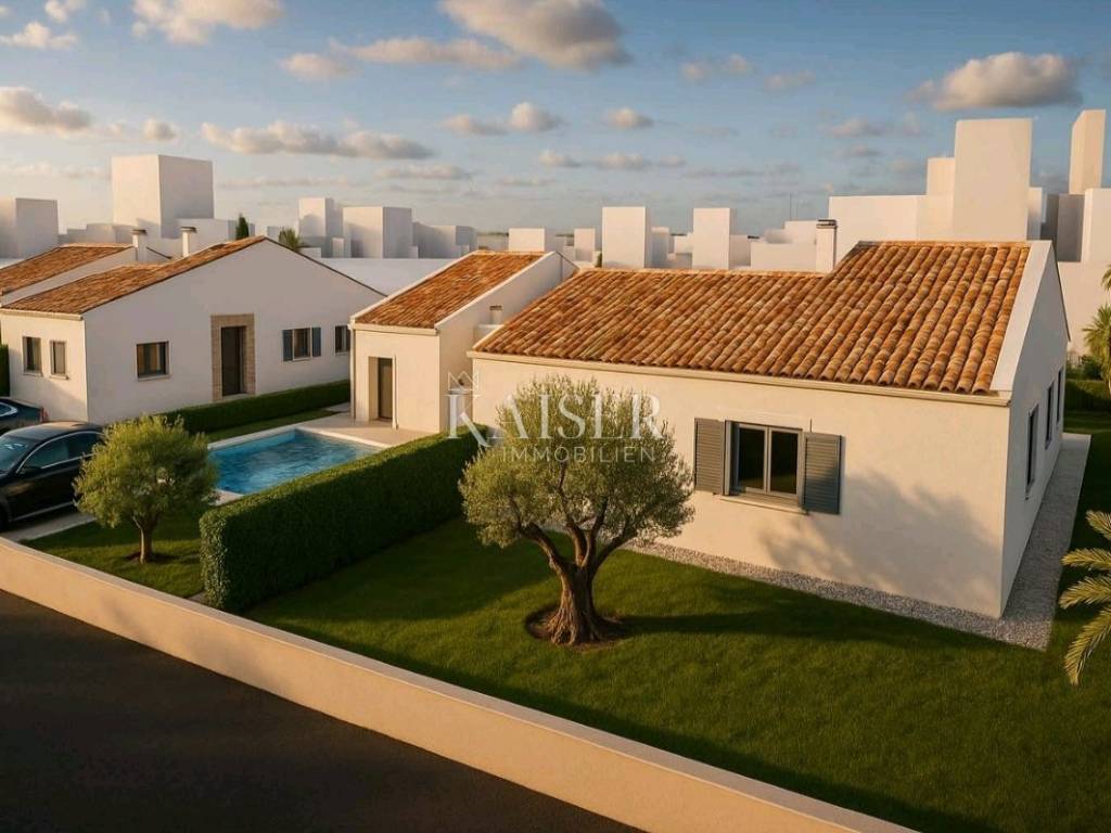 Kaiser Immobilien is selling a modern semi-detached house under construction with 3 bedrooms, garden and possibility of a swimming pool - a quiet location in Istria In a quiet Istrian village near Kaštelir, just a few minutes' drive from Poreč and beautiful beaches, this modern semi-detached house under construction is located - ideal for family life or as an investment for tourist rental. The house is being built on a plot of approximately 450 m², and the total area is 111.90 m² (closed area 89.50 m² + covered entrance and terrace 22.40 m²). The project provides for a functional layout that includes three spacious bedrooms, two modern bathrooms with toilets, and a kitchen, dining room and living room in an open space concept with access to a covered terrace and a landscaped garden. There is also a practical technical room and a covered entrance to the house. The possibility of building a swimming pool according to the buyer's wishes gives special value, which further increases the attractiveness of this property. Three private parking spaces are also available. The house will be equipped with modern heating and cooling systems: air conditioning, electric underfloor heating, PVC windows with triple glazing and electric shutters. It is connected to the water supply and has a proper building permit. Surrounded by vineyards, olive groves and untouched nature, this property perfectly combines contemporary design with a Mediterranean ambience. Estimated completion of construction and move-in: April 2026. For additional information and to organize a viewing, please contact us with confidence: Dean Cvitko E-mail: dean.cvitko@kaiser-immobilien.hr Tel: +385915284449 http://kaiser-immobilien.hr/