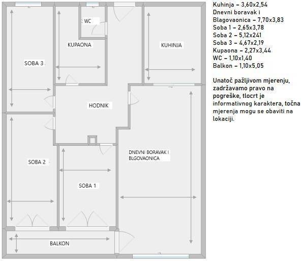 Stan ima ulazni hodnik, prostrani dnevni boravak povezan s blagovaonicom i novom kuhinjom, tri spavaće sobe, kupaonicu s kadom i toaletom, gostinjski WC te loggiu površine 5,5 m2 na koju se izlazi iz dvije sobe.