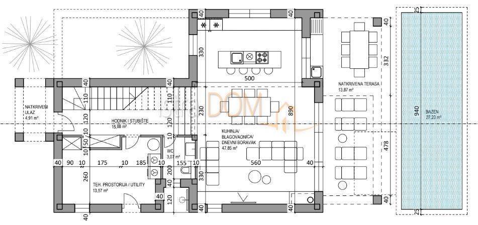 Uz zemljište dolazi i pravomoćna građevinska dozvola te plaćeni komunalni doprinos, što omogućava brzu i jednostavnu izgradnju. Projekt predviđa izgradnju katnice s bazenom, ukupne bruto površine 200 m², koja će sadržavati tri spavaće sobe, dvije kupaonice, dnevni boravak s kuhinjom i blagovaonicom, WC, ostavu, terasu te vanjski tuš, kuhinju i sunčalište.