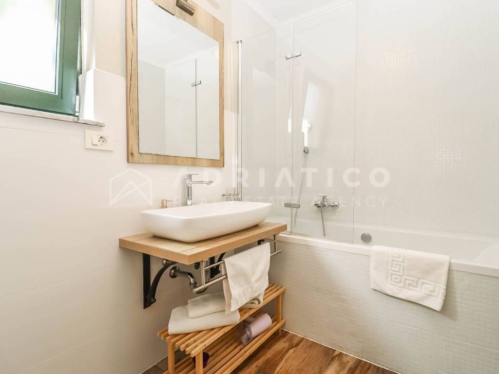 The landscaped plot of over 3,000 m is adorned with Mediterranean plants, fruit trees, and olive trees. In the yard, there is a saltwater swimming pool, an outdoor kitchen with a grill area, and a lounge space.