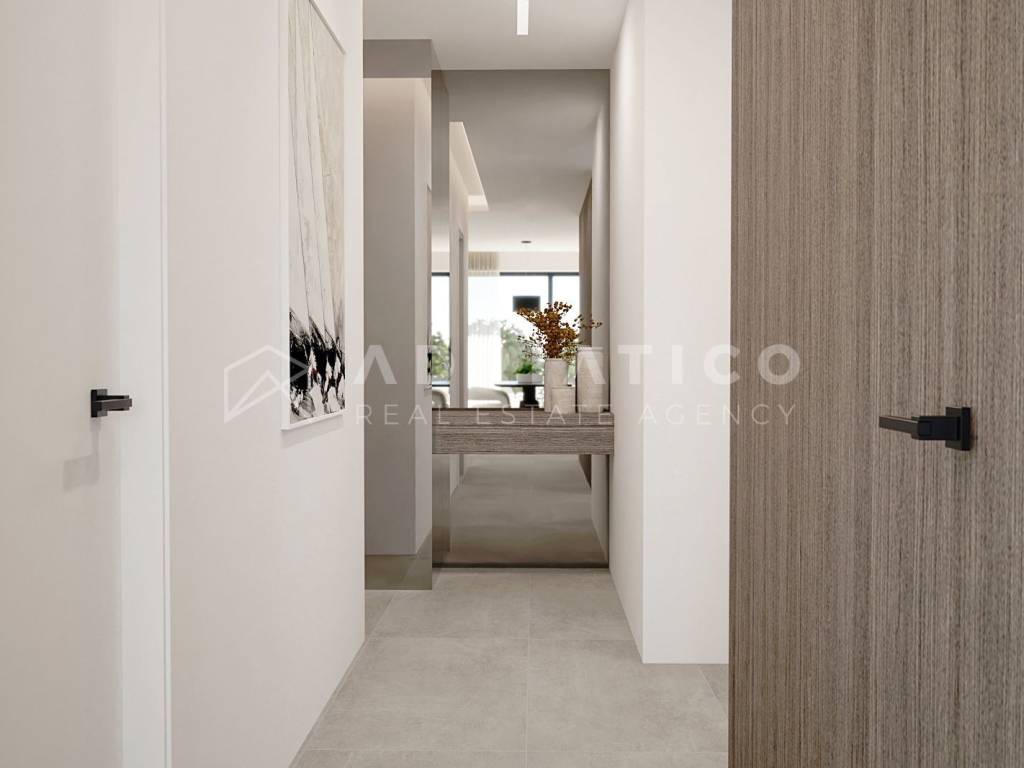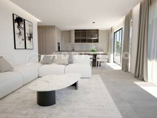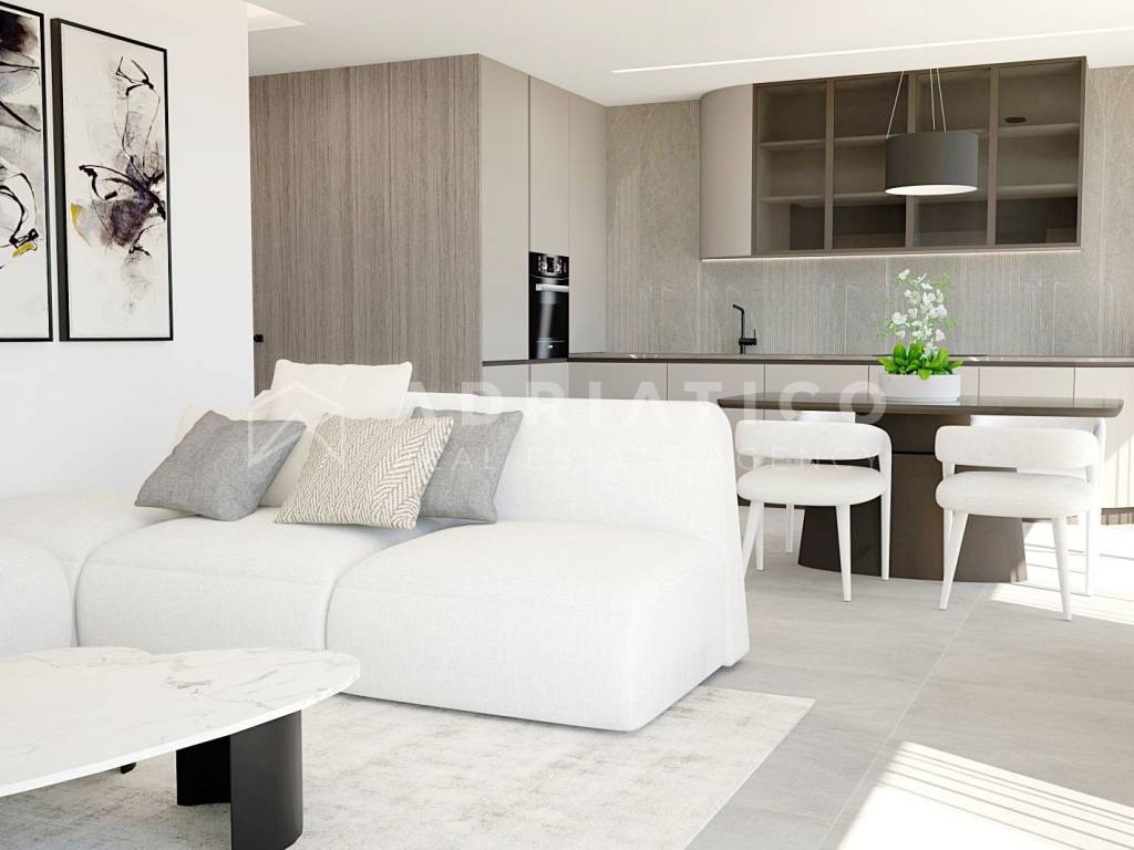 The ground-floor apartment with a living area of 100m2 consists of an entrance hall, kitchen, dining room, and living room combined with access to a large terrace, two bedrooms with en-suite bathrooms, a utility room, and a toilet.