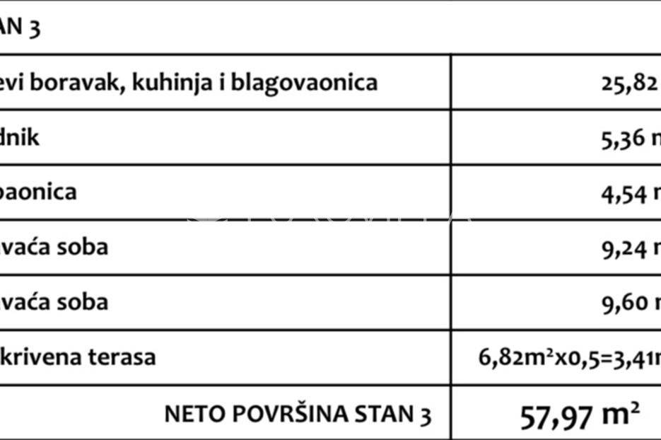 Predstavljamo vam projekt novogradnje u Šimunima, na vrhunskoj lokaciji u drugom redu do mora! Projekt se sastoji od dvije urbane vile, od kojih svaka ima pet stambenih jedinica. Vila A je već prodana u ranoj fazi gradnje, dok u Vili C trenutno imamo nekoliko slobodnih jedinica u ponudi.Zgrada se nalazi u drugom redu do mora, a od druge poznate šumovite plaže Šimuna udaljena je svega sto metara. U okruženju se također nalaze svi potrebni sadržaji za kvalitetan i ispunjen život te odmor. Vrhunska kvaliteta gradnje, pouzdanost izvođača i vlasnika te rijetko dobra lokacija na obali zaista su garancija odluke o kupnji stana u ovom projektu.Stan C3, neto korisne površine 57,97 m2, smješten je na 1. katu objekta C. Sastoji se od otvorenog prostora kuhinje, blagovaonice i dnevnog boravka (25,82 m2), hodnika (5,36 m2), dvije spavaće sobe (9,24 m2 i 9,60 m2), kupaonice (4,54 m2) te natkrivene terase (6,82 m2), s koje se pruža zaista predivan pogled na more. Stanu pripada jedno vanjsko parkirno mjesto.Zgrada je građena i opremana vrhunskim materijalima i opremom, među kojima izdvajamo:Fasadu sa sustavom ETICS i završnim slojem silikatnih premaza renomiranih proizvođača (JUB, CAPAROL, BAUMIT i drugi)Vanjsku PVC stolariju s trostrukim IZO staklom za izvrsnu energetsku učinkovitost i zvučnu izolacijuPraktikabilne detalje poput aluminijskih vanjskih klupčica, električnih roleta i komarnika na svim prozorimaProtuprovalna i zvučno izolirana ulazna vrataElegantnu unutarnju stolariju sa skrivenim pantima i magnetskim bravamaKvalitetne keramičke pločice prve klase u svim prostorijamaSanitarne elemente svjetskih brendova kao što su LAUFEN, IDEAL STANDARD i GROHE, uz ugradbene vodokotliće GeberitKomforno grijanje s podnim grijanjem u kupaonama i inverter klima uređaje u svakoj sobi (Samsung, Toshiba, Midea)Useljenje se očekuje u Lipnju 2026.PDV je uključen u cijenu te kupac ne plaća porez na promet nekretninama!Šimuni na Pagu su mirno, autentično dalmatinsko mjesto smješteno uz borovu šumu i prekrasne plaže, poznato po čistom moru i ugodnom ambijentu za obiteljski odmor. Ovdje ćete pronaći savršenu kombinaciju netaknute prirode i odlične infrastrukture, idealno za uživanje u ljetnim radostima. Mjesto nudi opuštenu atmosferu, blizinu restorana, trgovina i brojne mogućnosti za aktivan boravak u prirodi.Obratite nam se za više informacija i dogovor o razgledavanju.