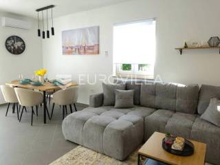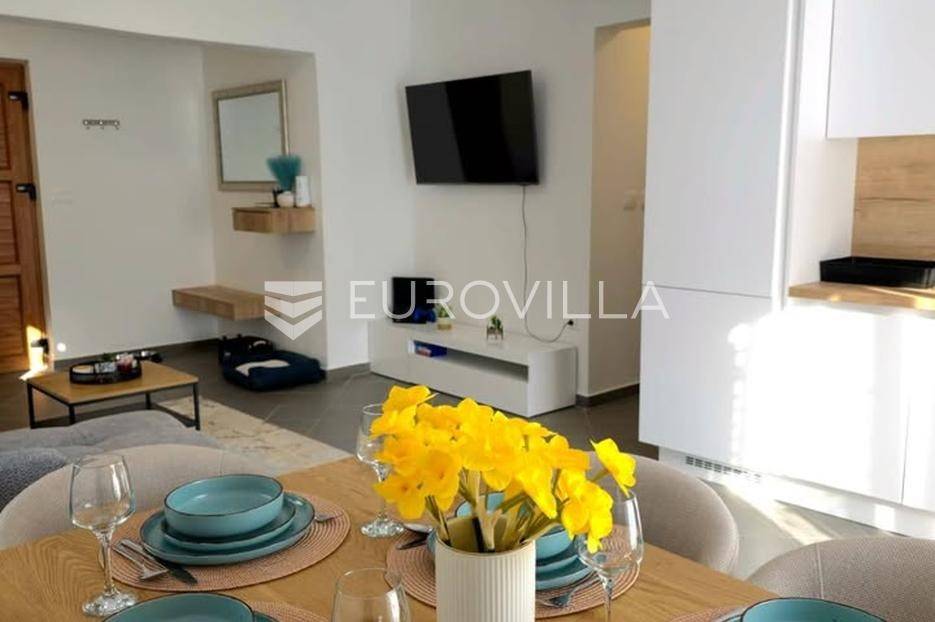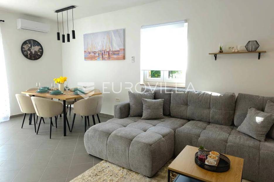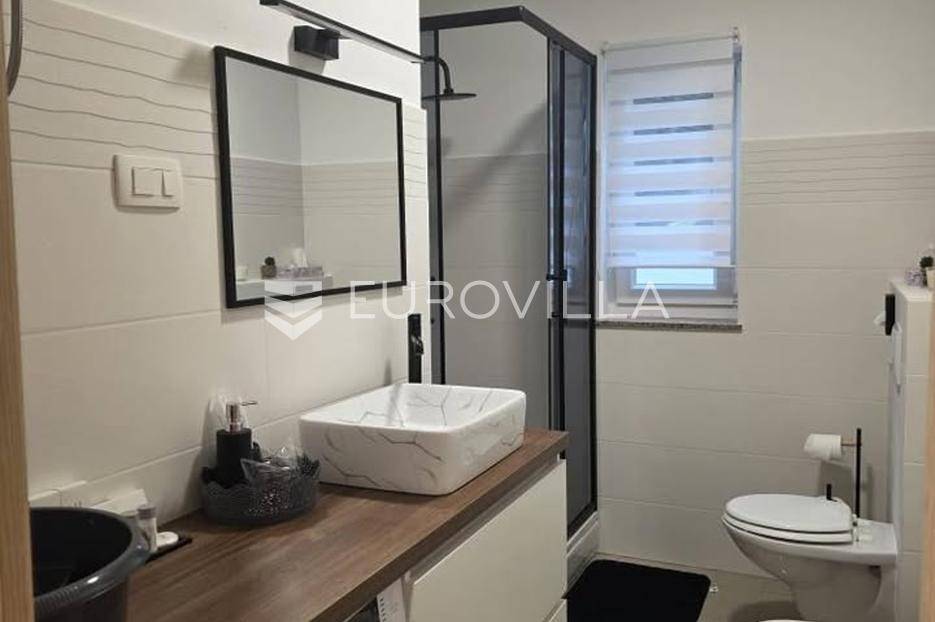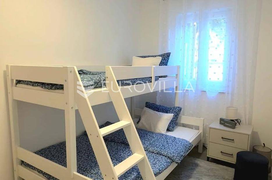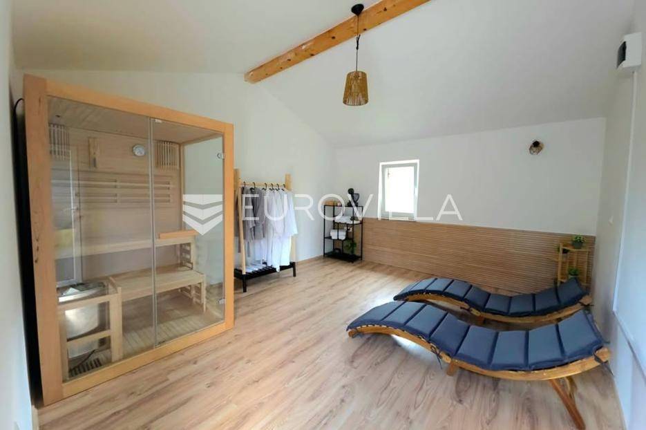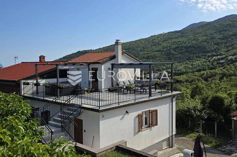 Kuća površine 131 m2 sastoji se od tri etaže.U suterenu se nalaze dvije odvojene prostorije. Jedna služi kao spremište a druga je trenutno opremljena kao prostor za druženje.Prizemlje je trosobni stan NKP 82 m2. Sastoji se od hodnika, dvije spavaće sobe, kupaonice i open space dnevnog boravka,kuhinje i blagovaonice iz koje ima izlaz na balkon.Na katu se nalazi prostorija u kojoj je smještena sauna. Iz prostorije je izlaz na terasu površine 54 m2 na kojoj su smještene dvije pergole, ispod jedne se nalazi jacuzzi a ispod druge vrtna garnitura. S terase se pruža spektakularan pogled.Kući pripada i 350 m2 uređene okućnice na koje se nalaze tri parkirna mjesta, dječje igralište i grill zona.Nekretnina je u potpunosti renovirana uključujući podne i zidne obloge, instalacije, sanitarije, stolarija i prodaje se namještena. Kuća ima i novu fasadu i krov.Nekretnina je pogodna kao obiteljska kuća ili kao investicija. Ima riješenu kategorizaciju i trenutno se iznajmljuje.Smještena je 2 km od mora okružena predivnom prirodom.Vlasništvo čisto.Za ostale informacije obratite nam se s povjerenjem.