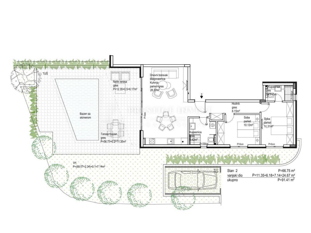 A modern two-bedroom apartment is for sale on the ground floor of a luxurious new building located first row to the sea in Sukošan.