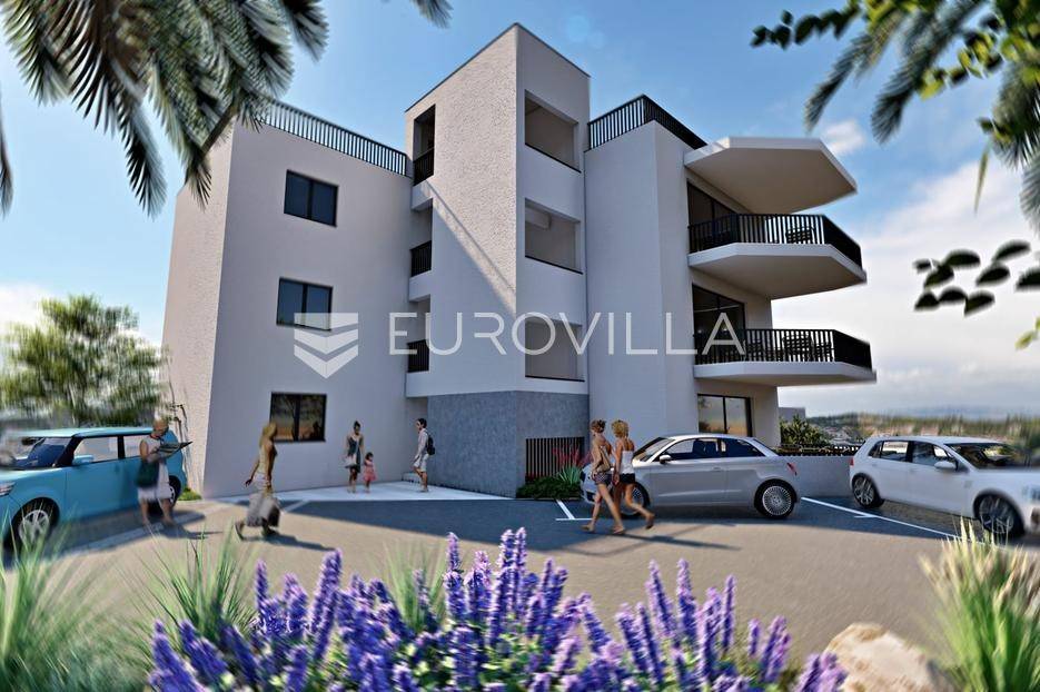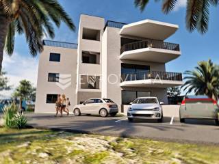 Čiovo, Okrug Gornji - projekt moderne stambene novogradnje manje zgrade sa šest stanova s terasama i garažom blizu centra mjesta.Stan S5Nalazi se na drugom katu i sastoji se od hodnika, kupaonice, dvije spavaće sobe i zajedničkog prostora kuhinje, blagovaonice i dnevnog boravka s izlazom na prostranu terasu površine 14 m2. Zatvorena površina stana je 54,56 m2, pripada mu i jedno garažno mjesto te krovna terasa površine 70 m2 s koje se pruža divan pogled na more. Ukupna prodajna površina stana je 86 m2.U opremanju stana koriste se kvalitetni materijali i oprema te kupac ovisno o fazi izgradnje može utjecati na interijer stana. Useljenje se planira krajem 2026. godine.Mirna lokacija samo par minuta hoda do centra Okruga.Više informacija na upit.