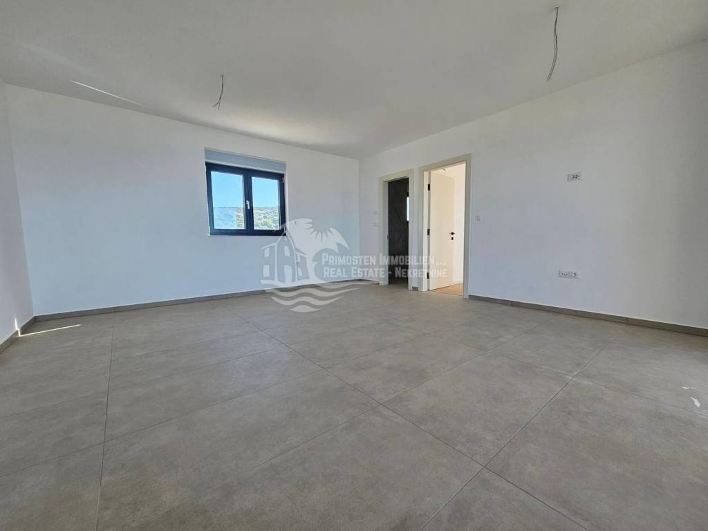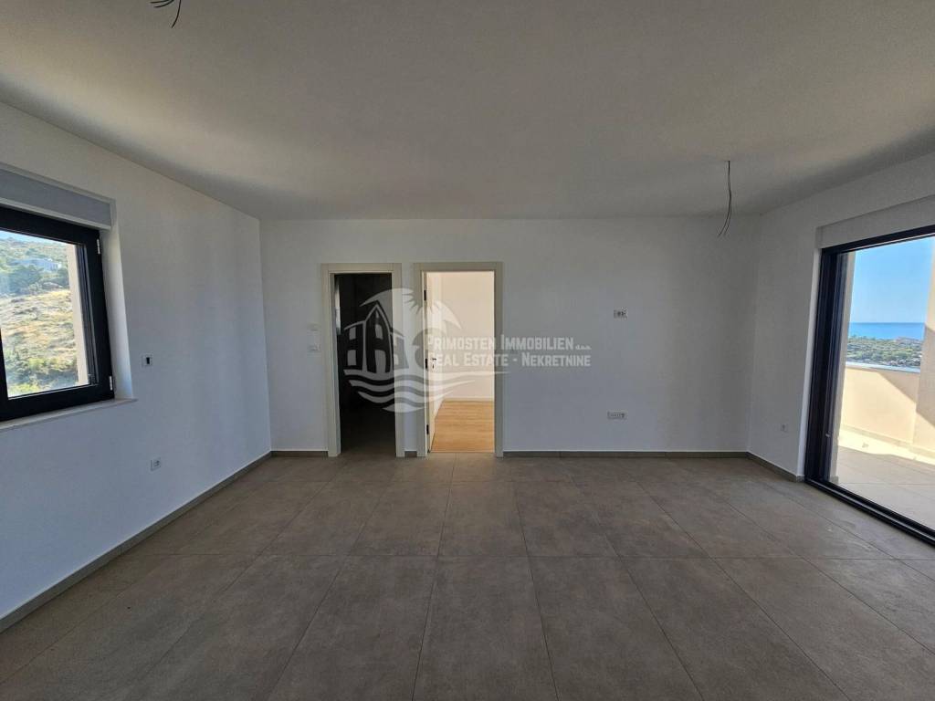 In Primošten-Dolac, an exclusive penthouse apartment with a stunning, unobstructed sea view is for sale. Situated on the top floor of a modern building with eight residential units, just a few minutes’ walk from the sea, it offers a spectacular panoramic view of the Adriatic and the Mediterranean coastline. Apartment S7 features an open-plan living and dining area with kitchen, a spacious terrace (35,71 m² total, 11.04 m² covered and 24,67 m² open) with electricity and water connections and a prepared drain for a hot tub (not included in the price), one bedroom, one bathroom, and an entrance area. A parking space is included in the purchase price. Restaurants are within walking distance, the center of Primošten is about 2.8 km away, and Split Airport is approximately 40 km away. The penthouse is ready to move in (unfurnished) and offers peace, privacy, and an unforgettable sea view.