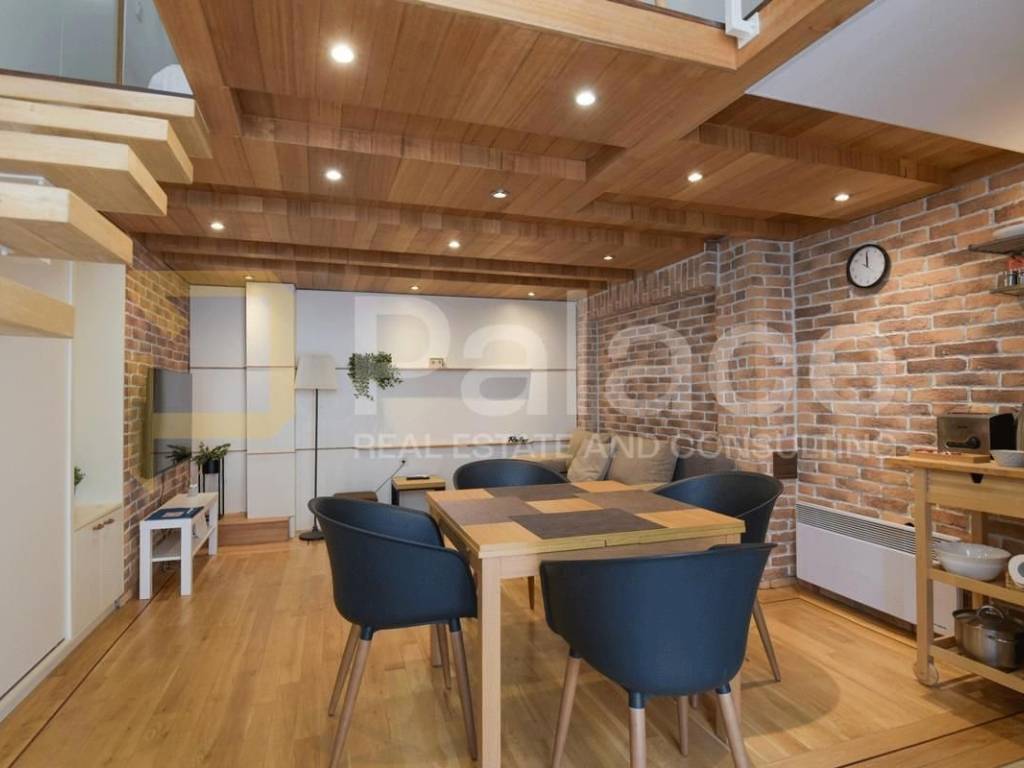 The apartment consists of an open concept layout, which includes a kitchen, dining area, living room, and stairs leading up to a gallery where the bedroom and bathroom with toilet are located.