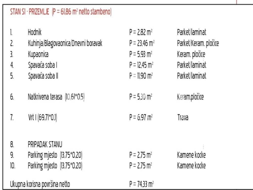 The layout of the 74.33 m² apartment consists of an entrance hall, kitchen, dining area, bright living room with access to a spacious terrace, two bedrooms, and a private garden of 70 m². The apartment includes two parking spaces, and there is the option to build a pool with an additional payment. The beautiful Adriatic Sea is only 1,500 meters away, making this property a perfect choice for those who want to enjoy a peaceful seaside environment.