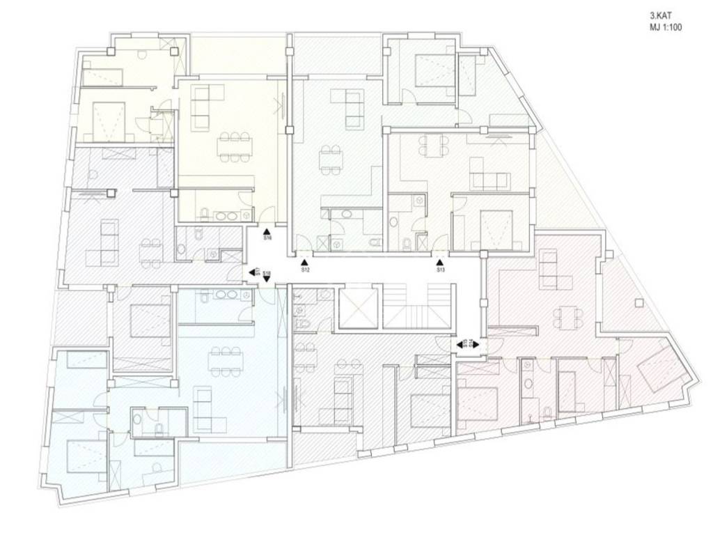 The building will have a basement, ground floor, three floors and a roof with roof terraces. In the basement there will be apartment storage rooms and garage parking spaces. Business premises are planned on the ground floor. There will be 18 apartments on the 1st, 2nd and 3rd floors. The apartments are of different sizes and layouts, and each apartment will have a loggia or terrace with a view of the sea or the city.