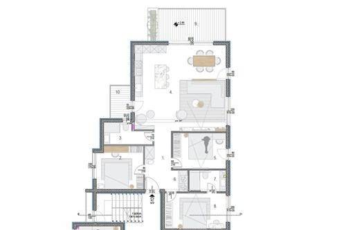 Sastoji se od: hodnika, 2 spavaće sobe, 2 kupaonice, prostranog dnevnog boravka s kuhinjom i blagovaonicom, dva balkona te pripadajuće krovne terase