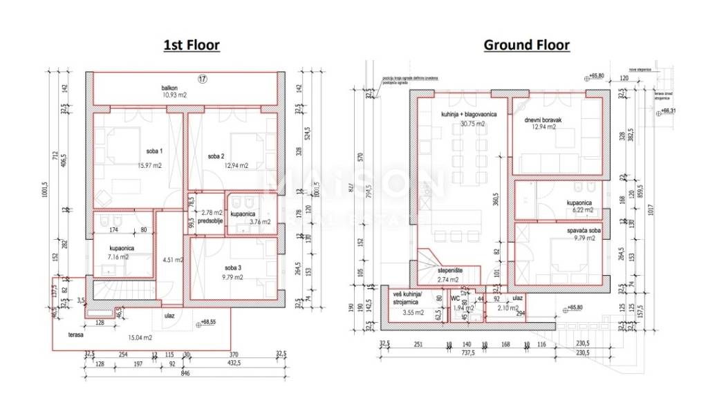 The internal staircase connects to the first floor, where three spacious bedrooms and two bathrooms are located. All rooms have access to balconies, each offering open views of the sea. The roof is equipped with solar panels, and each room features an inverter air conditioning unit for maximum comfort.
