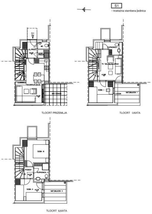 Prvi kat nudi dodatni dnevni boravak ili TV salon, spavaću sobu, kupaonicu te natkriveni balkon koji pruža dodatan prostor za opuštanje. Unutarnje stepenice vode na zadnju etažu.