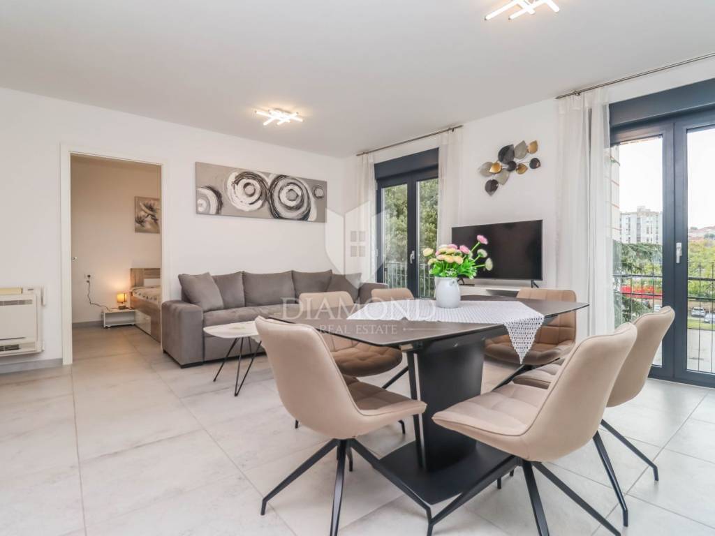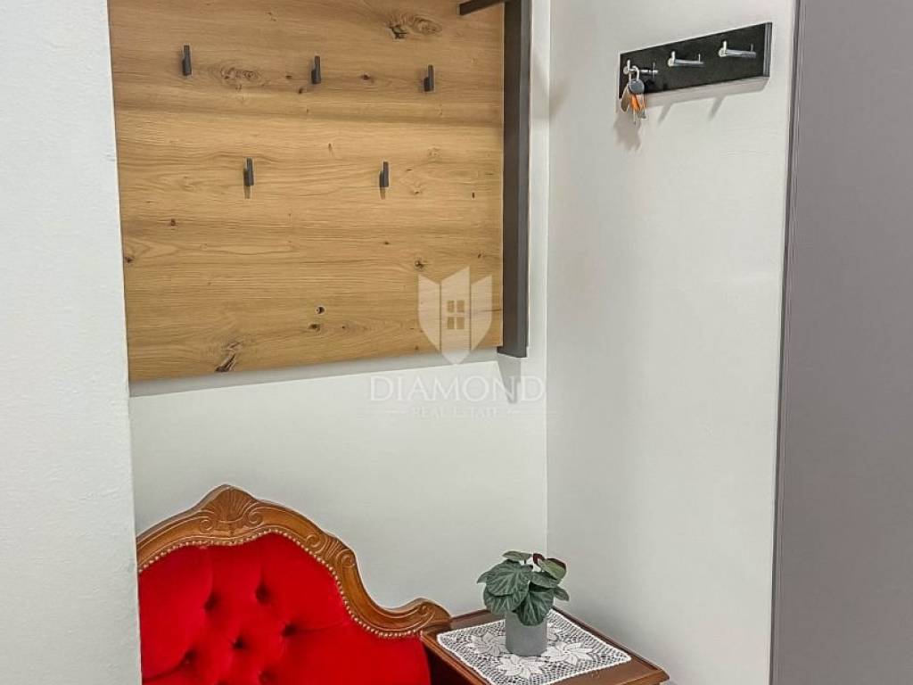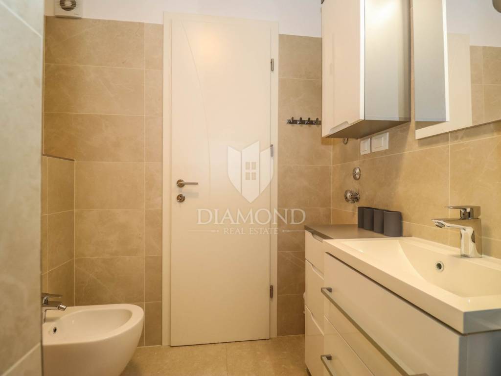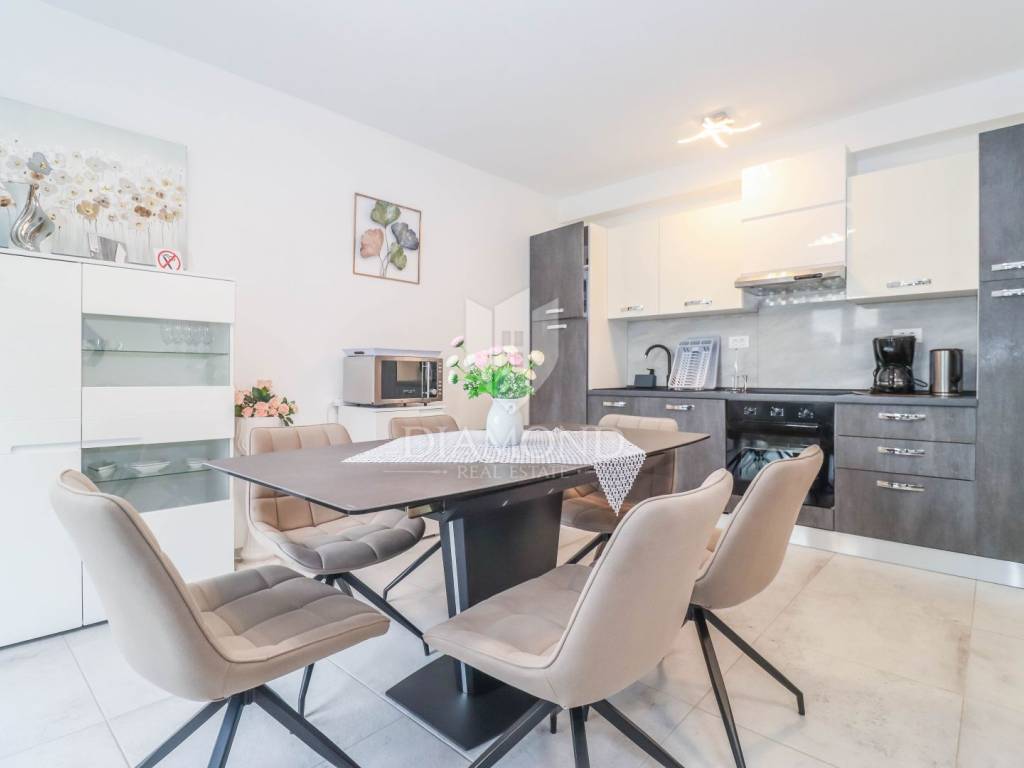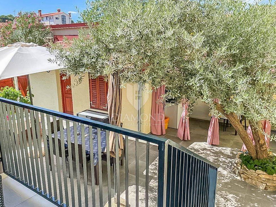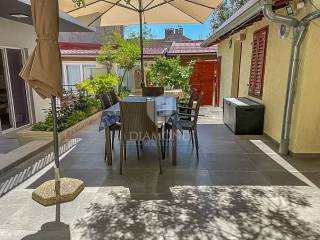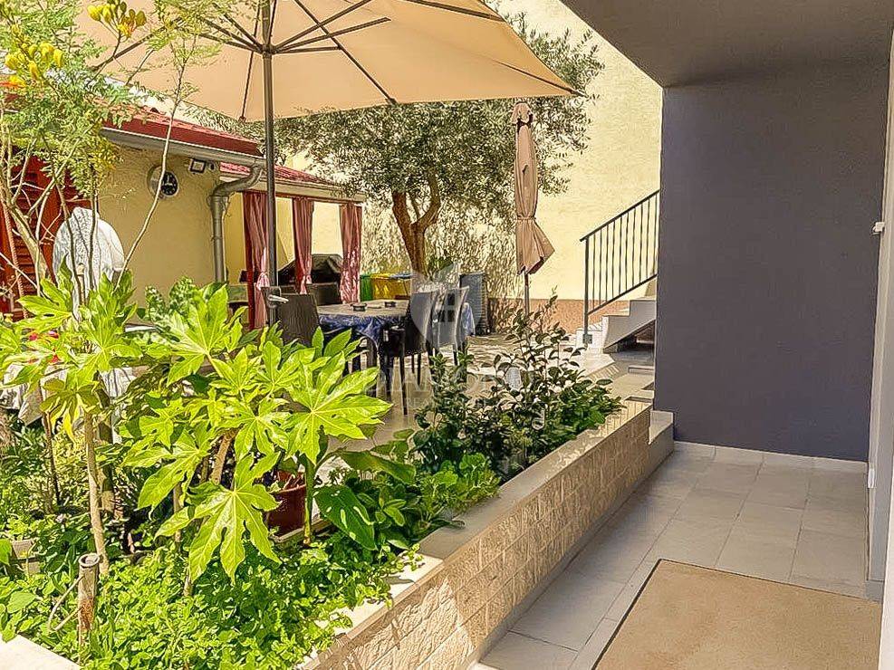 This modern three-level property consists of three fully equipped contemporary apartments and a spacious 50 m² garage with two parking spaces. The garage area also includes a technical room with a heat pump, laundry area and an extra toilet. Both the main entrance and garage lead to the internal staircase that connects all residential units. Ground floor: 55 m² apartment with a bright open-plan living area, kitchen and dining, two bedrooms (one with access to the courtyard), and a stylish bathroom with walk-in shower and underfloor heating. First floor: almost identical 56 m² layout including a balcony overlooking the garden. Second floor: charming 46 m² attic apartment featuring one bedroom, open living and dining area, kitchen, bathroom and a private roof terrace perfect for relaxing. High-quality materials and comfort were prioritized throughout: Dierre security doors, Daikin air-conditioning, aluminum windows with triple glazing and electric shutters. Each apartment has separate electricity and water meters. The units are fully furnished, tastefully decorated and ready to move in. The property is currently successfully operated as a tourist rental with proven business results and excellent guest reviews.