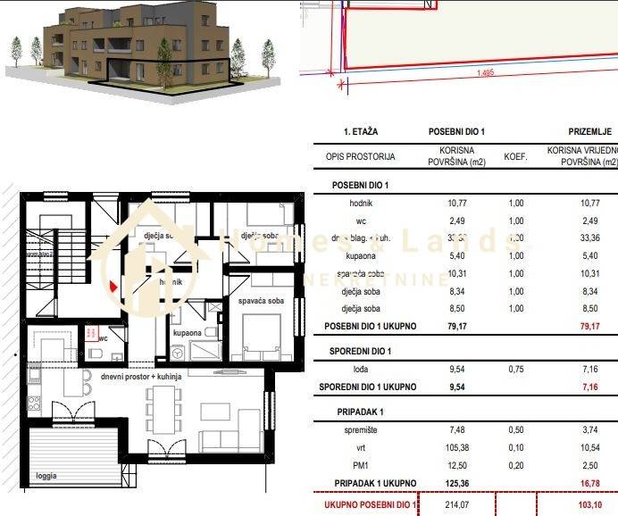 4-soban stan oznake S1 u zgradi MF3 ukupne korisne površine 214,10m2(103,10m2 obračunske površine) sastoji se od hodnika,kuhinje s blagovaonicom,dnevnog boravka,tri spavaće sobe,dvije kupaonice,loggie, spremištanprostranog vrta i parkinga.