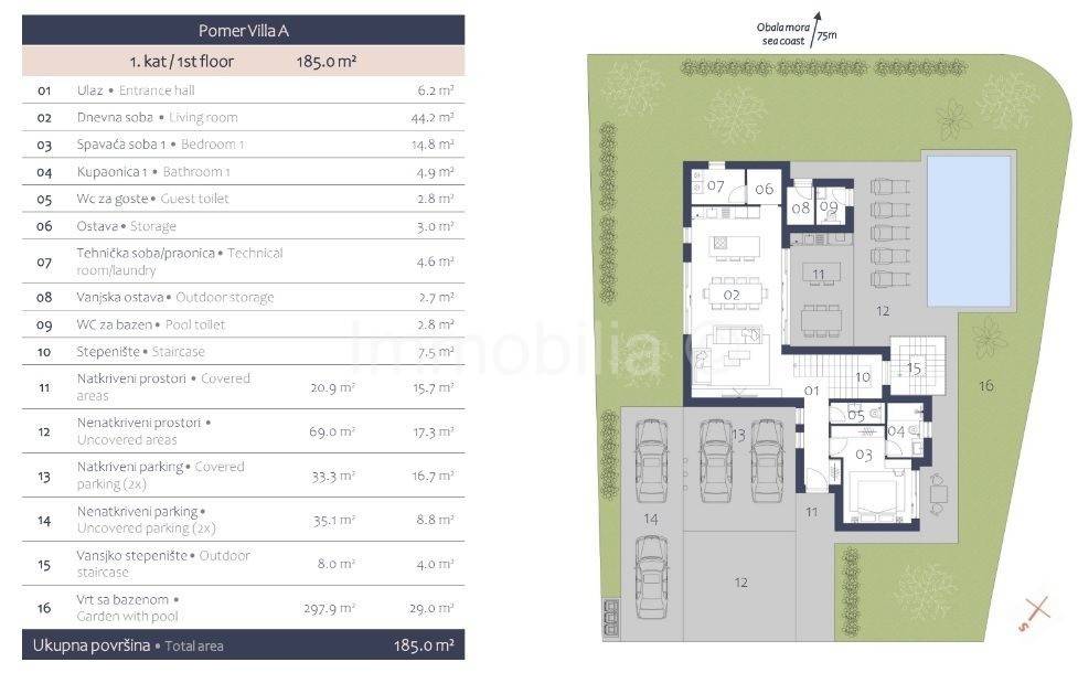 Vila je trenutno u fazi izgradnje , a sastoji se od ukupno 4 spavaće sobe, 4 kupaonice , 2 toaleta te predivne krovne terase od 112 m2 sa pogledom na more.