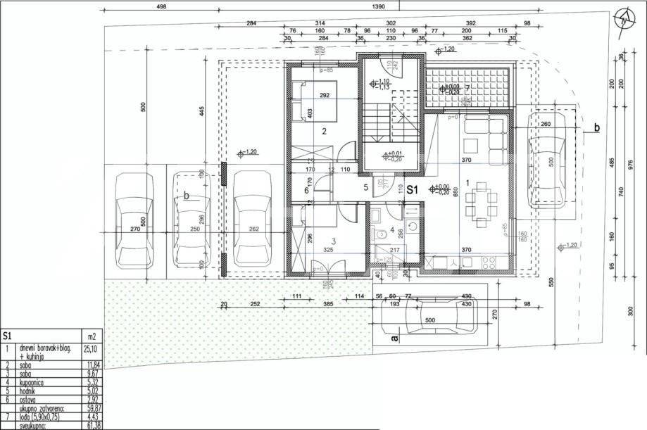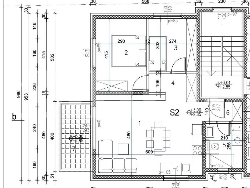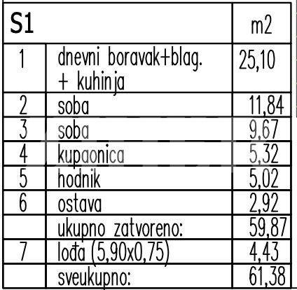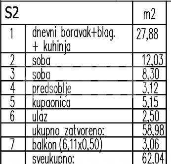 S2 - stan se sastoji od dnevnog boravka s kuhinjom i blagavaonicom, dvije spavaće sobe, kupaonice, ukupne površine 59 m2. Stanu pripada balkon od 6 m2 i natkriveno parkirno mjesto, ukupne prodajne površine 68,34 m2 = cijena 260.000 eura