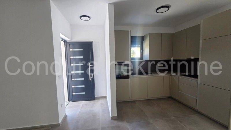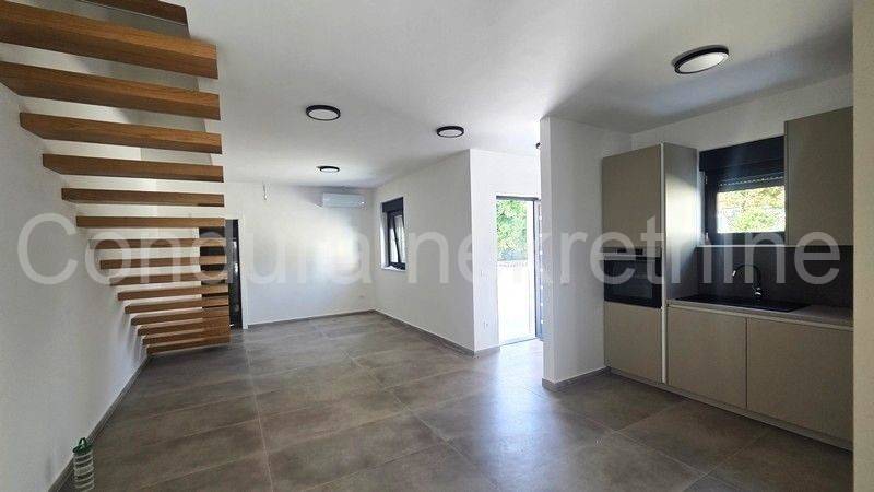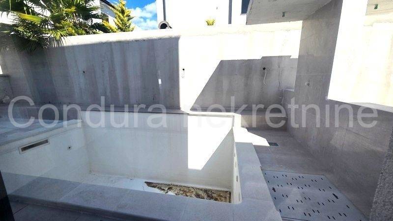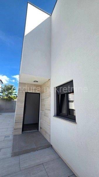 Two apartments are for sale in a quiet area of Zaton, administratively part of the town of Nin. The apartments are labeled S1 and S2 and are located in a detached building with two duplex units, each consisting of a basement, ground floor, and first floor with a flat roof. Both apartments include a private garden and swimming pool. They are sold unfurnished, with a built-in modern kitchen.