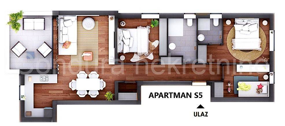 Apartment S5 (three-bedroom) has a total net usable area of 111.49 m and consists of: