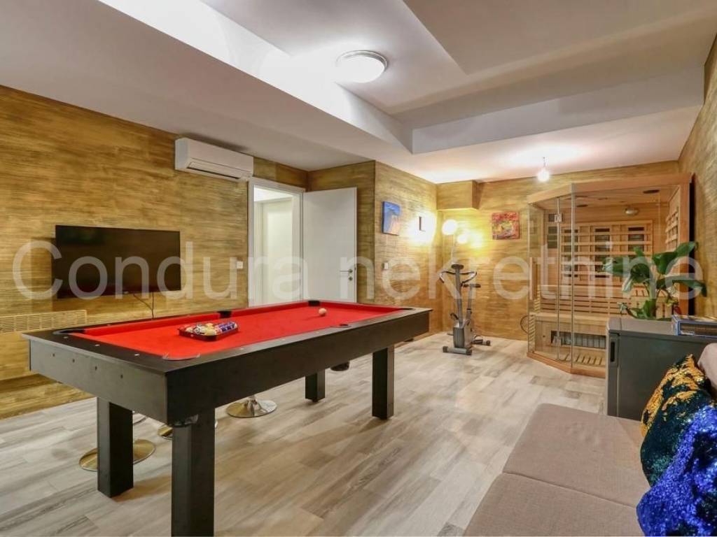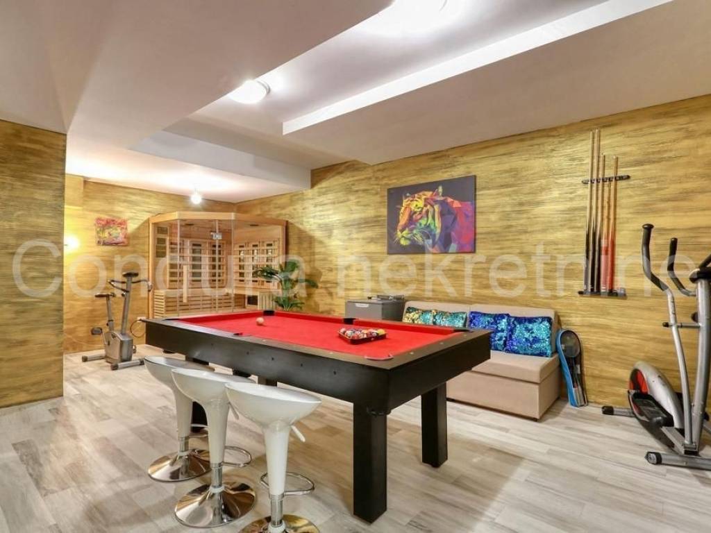 The building consists of a basement, ground floor and one upper floor and has a net usable area of 141.99 m2. In the basement there is a space for gathering with pool table, TV, exercise bike, sauna and one bathroom. On the ground floor there is one bathroom, a spacious living room with a dining room and a kitchen and an exit to a covered terrace with a view of the pool and a garden with a barbecue. Upstairs there are three bedrooms and two bathrooms.
