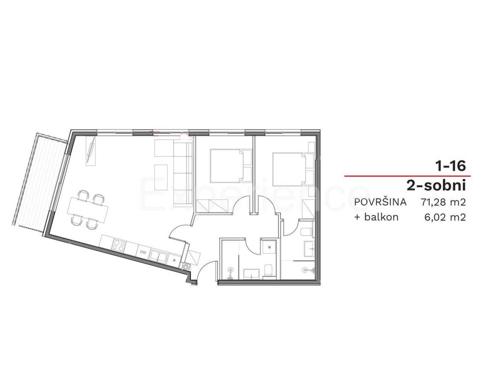 On sale is an apartment situated on the first floor of the building, surface of 75,80 m. Contains: entrance hall, an open and bright space in which there is a living room, dining room and kitchen with access to the balcony (6,02 m), two bedrooms and two bathrooms. The apartment also has a storage (3.15 m), outdoor parking space and garage parking space.