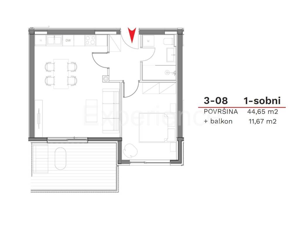 On sale is an apartment situated on the third floor of the building, surface of 52,49 m. Contains: entrance hall, an open and bright space in which there is a living room, dining room and kitchen with access to the balcony (11,67 m), bedroom and bathroom. The apartment also has a storage (3 m) and garage parking space.