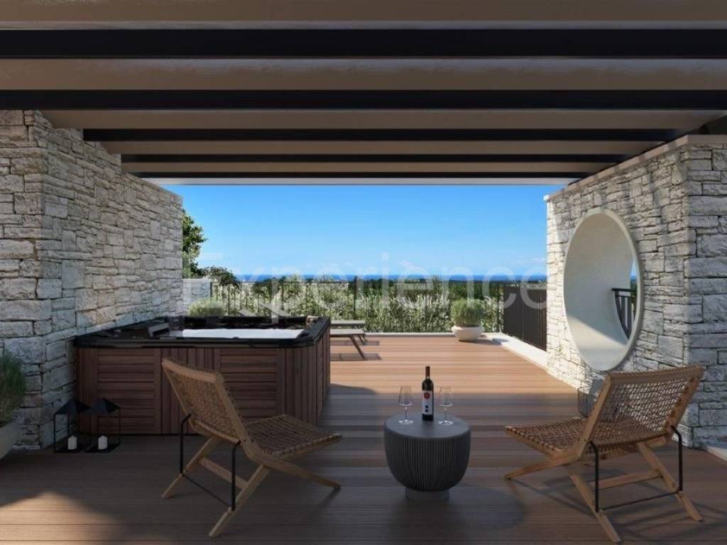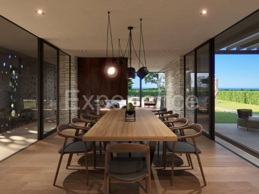 The exterior of the villa, which is adorned with a facade in part in stone, a choice of earth tones, attractive and at the same time simple design are perfectly combined in the surrounding Istrian landscape. The interior of the villa includes a total of 230 m of living space. Modern design, high ceilings and glass openings create an extraordinary width with a beautiful panoramic view of the sea.