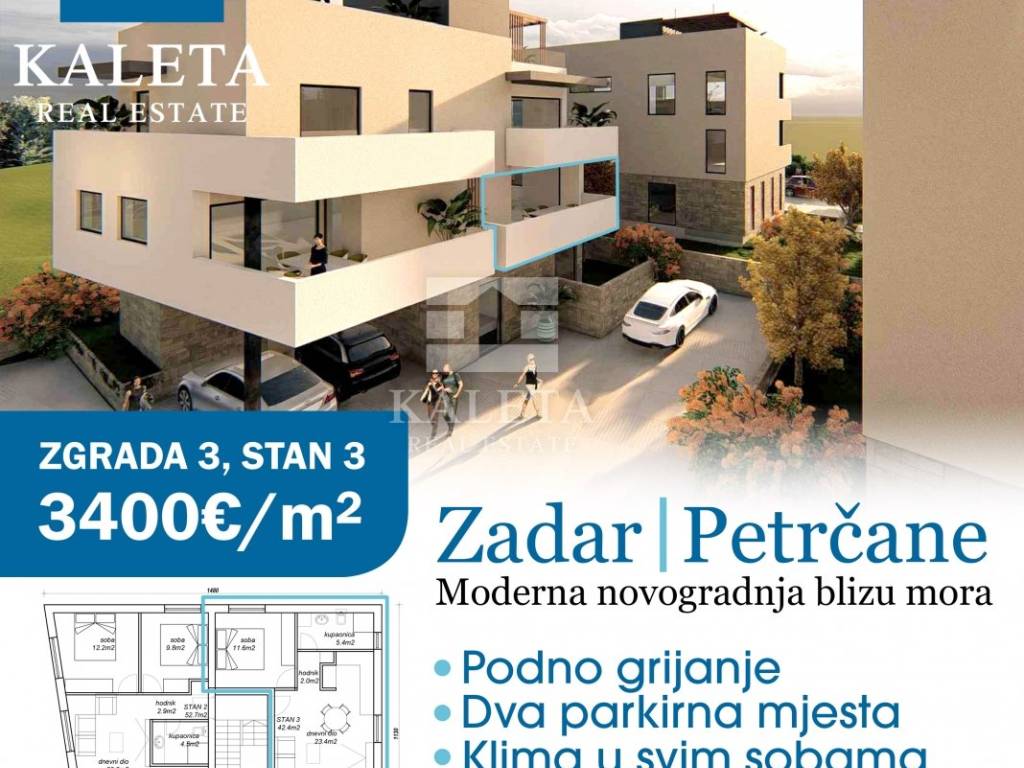Apartments for sale in a new residential area in Petrčane near Zadar, only 650 m from the sea (air distance). The project consists of 5 buildings, each with 4 apartments, and every apartment includes 2 parking spaces.