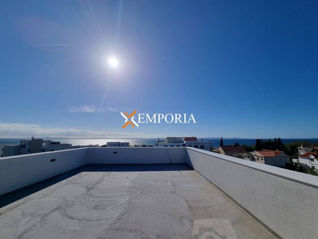 Penthouse apartment in Privlaka is for sale, located only 150 meters from the sea. It is a modern new building.The apartment is located on the 2nd floor of the building. The layout of the rooms consists of a hallway, bathroom, living room with kitchen and dining area, two bedrooms, and a covered terrace (net 67,39 m2). From the staircase, you access the roof terrace with an area of 72,44 m2. The net usable area of the described rooms is 85,50 m2.In addition, the apartment includes two parking spaces in front of the building.The total net area of the apartment with all additional parts is 90,50 m2.The distance of this property from the center of Privlaka is 1.8 km.The building is under construction, and completion is planned for the summer of 2025.