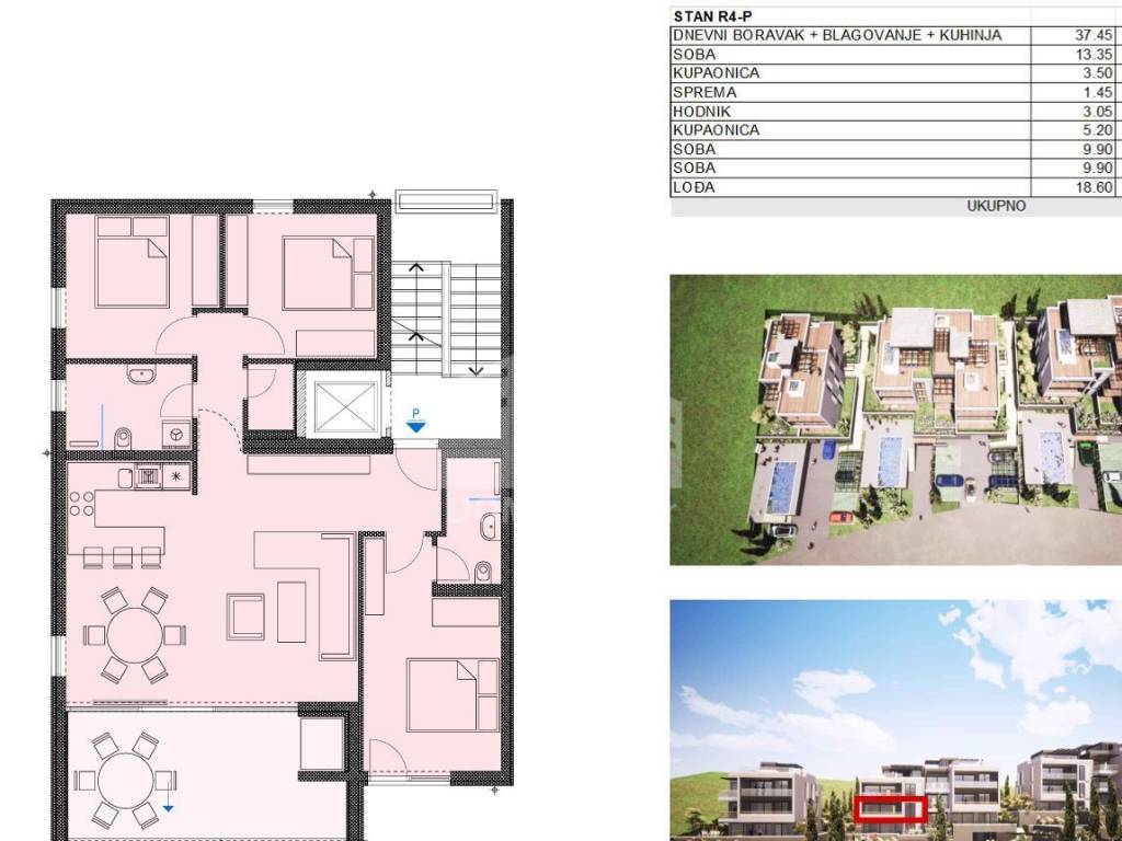 The apartment consists of a hallway, a living room with a kitchen and a dining room, three bedrooms, a storage room, two bathrooms with a toilet, and a comfortable loggia with a beautiful view of the sea and the islands.
