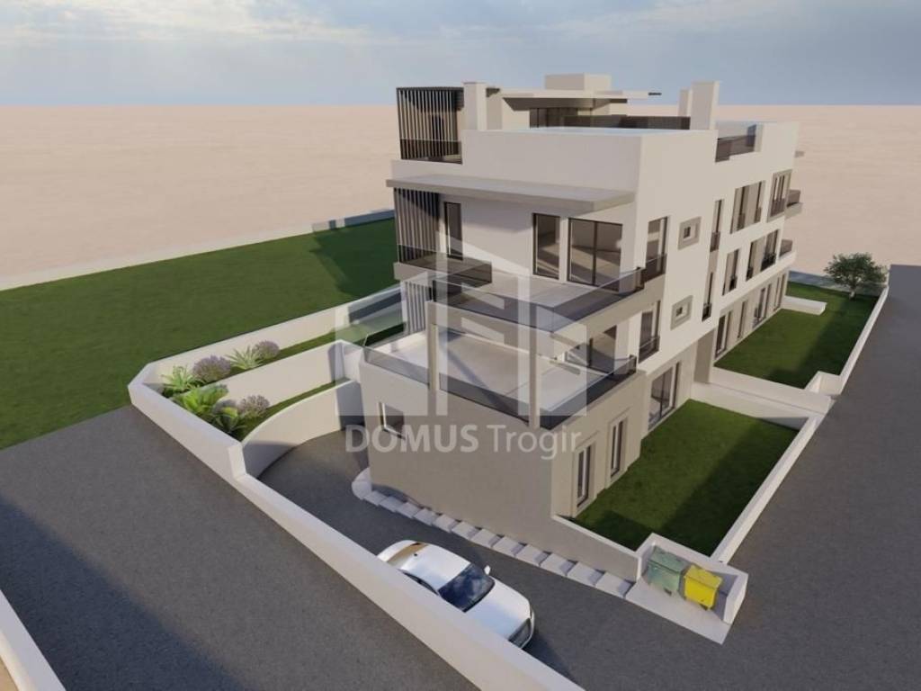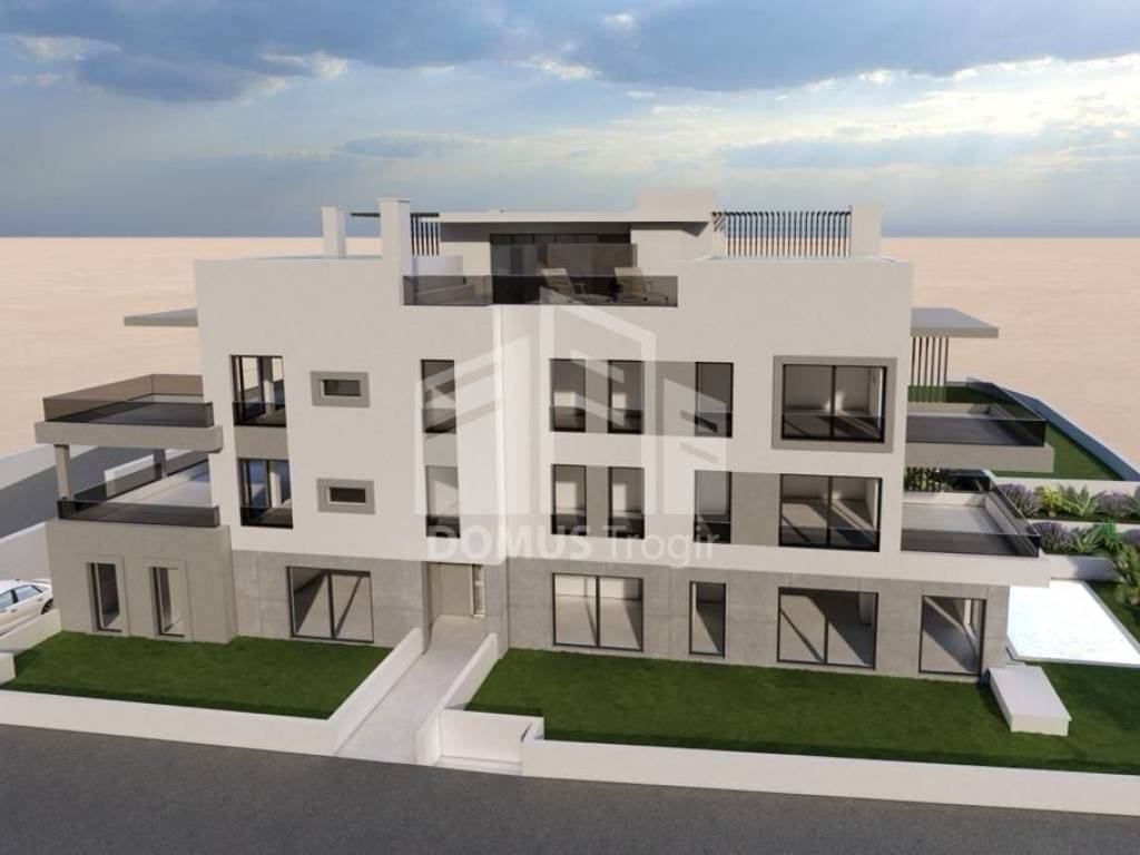 A beautiful three-room apartment for sale located in Okrug Gornji on the island of Čiovo, in a luxury building that is currently under construction. The planned move-in is scheduled for the summer of 2025. This unique apartment, with a total area of 110 square meters, is located on the ground floor of the building and offers an exceptional combination of luxury and comfort, with a private garden and swimming pool, ideal for relaxing and enjoying sunny days.