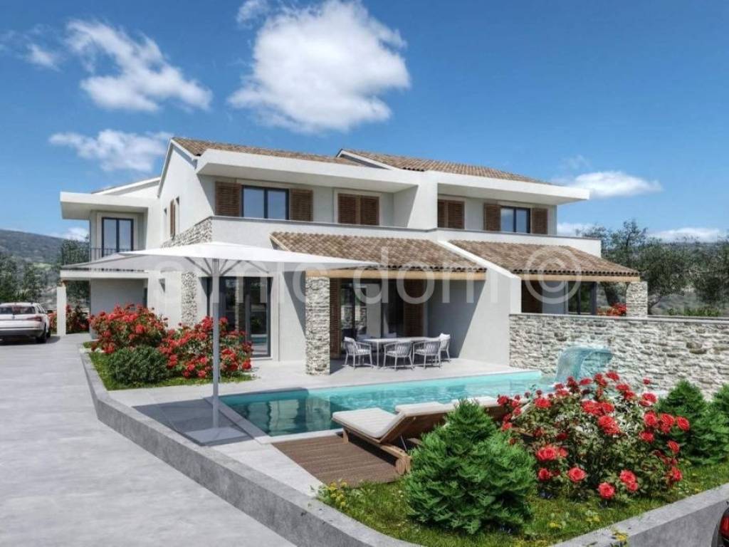 A family house with a swimming pool is for sale in the beautiful village of Jezera on Murter, close to a pebble beach. It is a charming terraced house designed in a beautiful Mediterranean stone style. House S1 consists of two floors with a total area of 141 m2, or a net usable area of 115.95 m2, including coefficients. The ground floor consists of a hallway, bathroom, bedroom and an open living room with kitchen and dining room with access to a spacious terrace with a sundeck, an outdoor pool of 23.76 m2. On the first floor there are two bedrooms (one with a terrace), a bathroom and a storage room. The house is superbly equipped: carpentry with mosquito nets and shutters, high-quality ceramic tiles, underfloor heating. The yard is completely fenced, and there is also a parking space for cars. The house is located in a beautiful quiet street only 680m from the pebble beach and 550m from the city center. The house will be ready for occupancy by summer 2026.